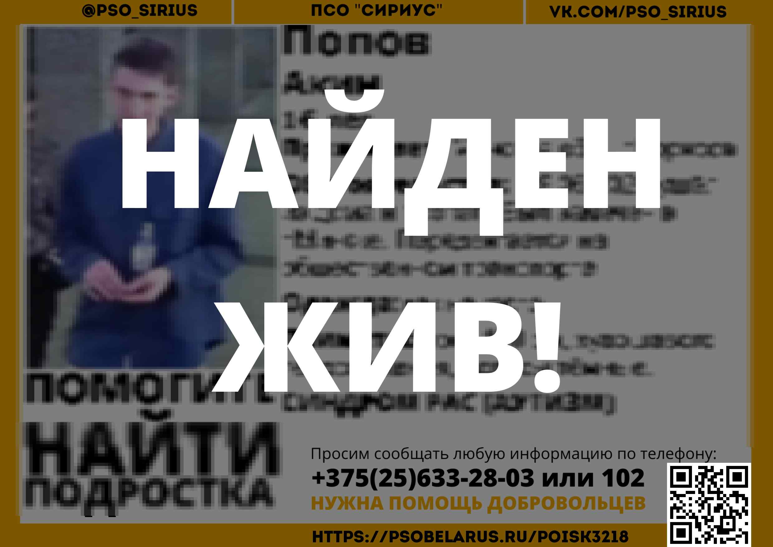 Всех, кто владеет информацией, просим сообщить: ПСО "Сириус" +375(25)633-28-03 |