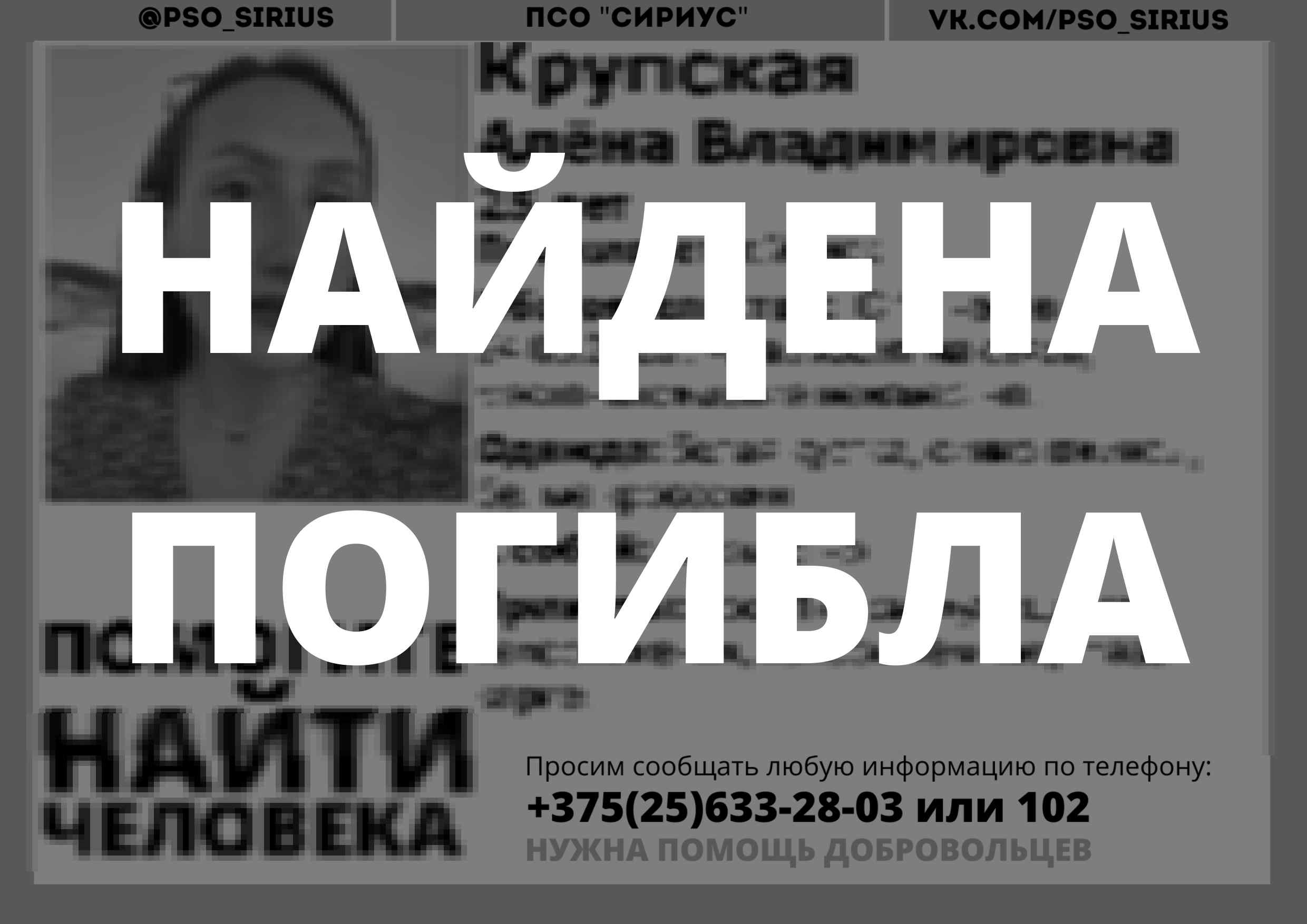 Всех, кто владеет информацией, просим сообщить: ПСО "Сириус" +375(25)633-28-03 |
