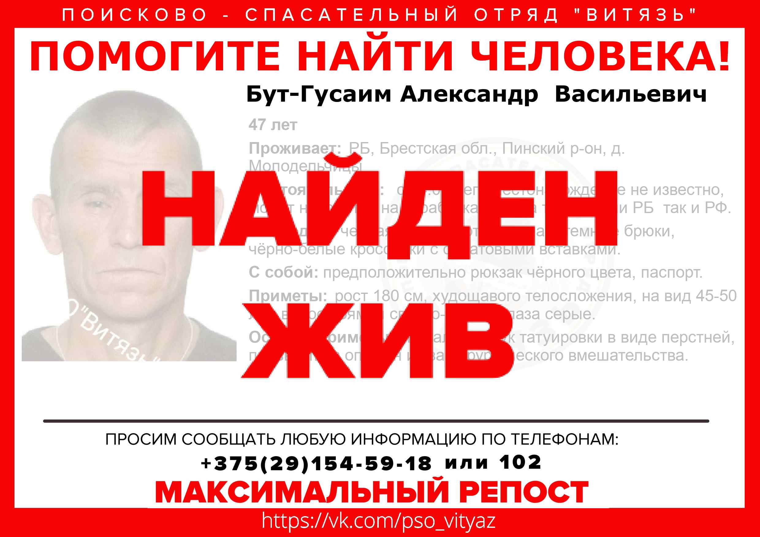 Всех, кто владеет информацией, просим сообщить: ПСО "ВИТЯЗЬ" +375(29)154-59-18 |