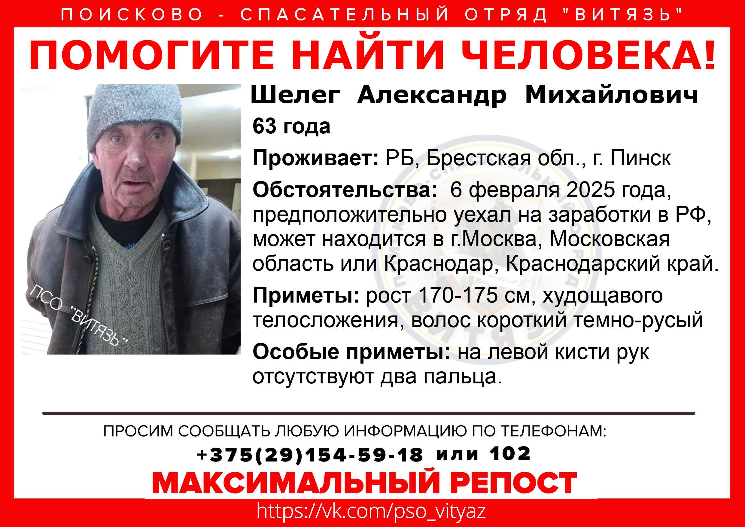 Всех, кто владеет информацией, просим сообщить: ПСО "ВИТЯЗЬ" +375(29)154-59-18 |