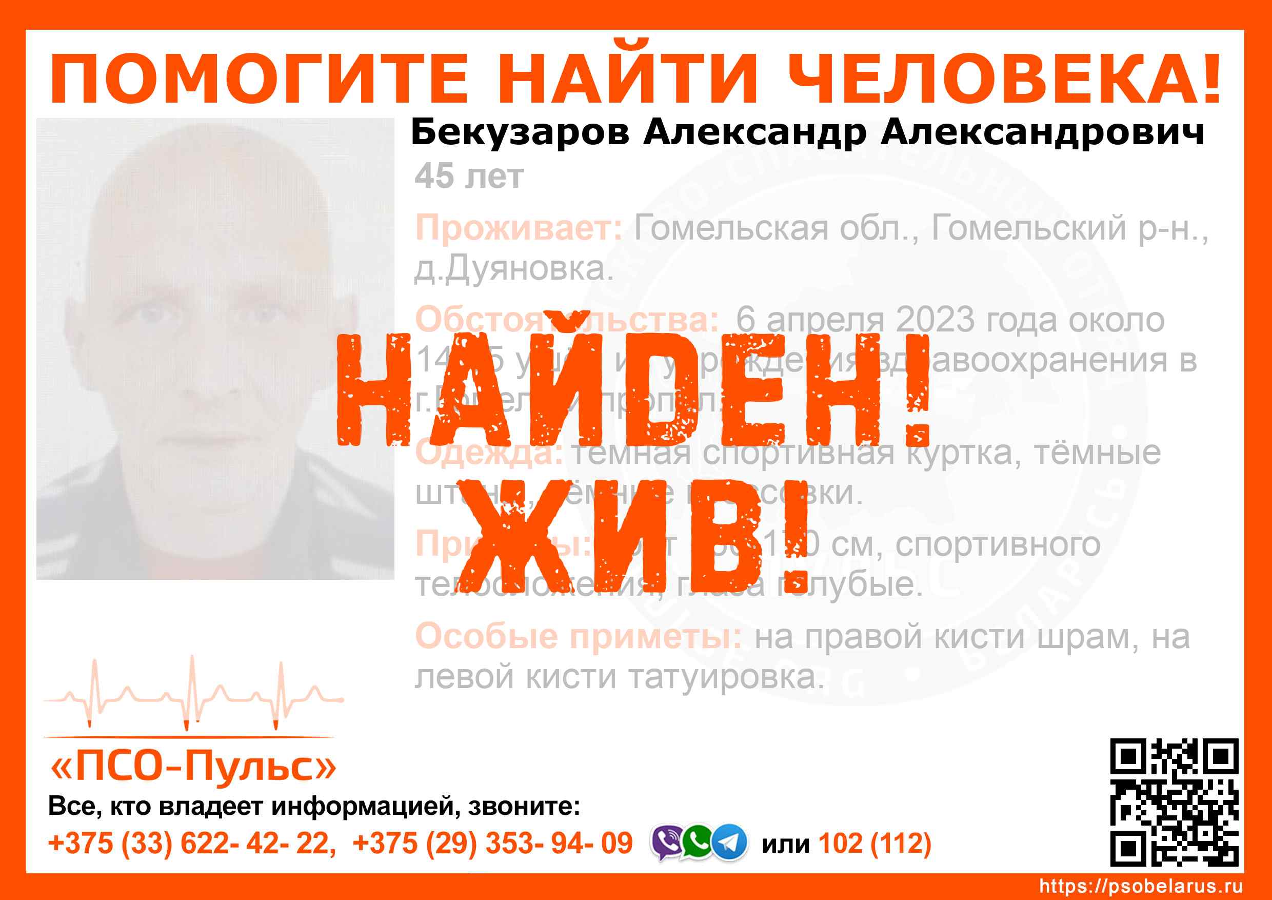 Всех, кто владеет информацией, просим сообщить: ПСО "ПСО-Пульс" +375(33)622-4222 |