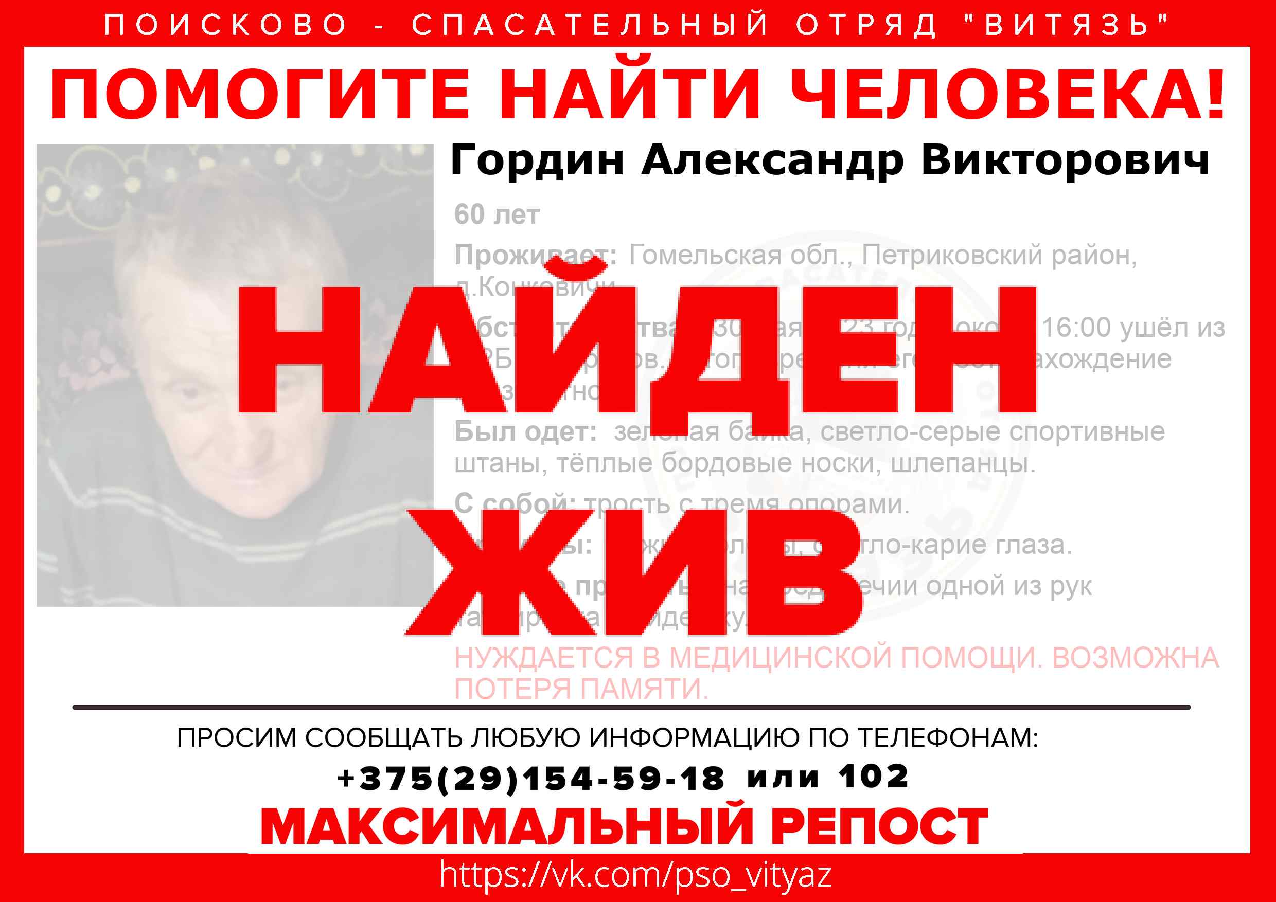 Всех, кто владеет информацией, просим сообщить: ПСО "ВИТЯЗЬ" +375(29)154-59-18 |
