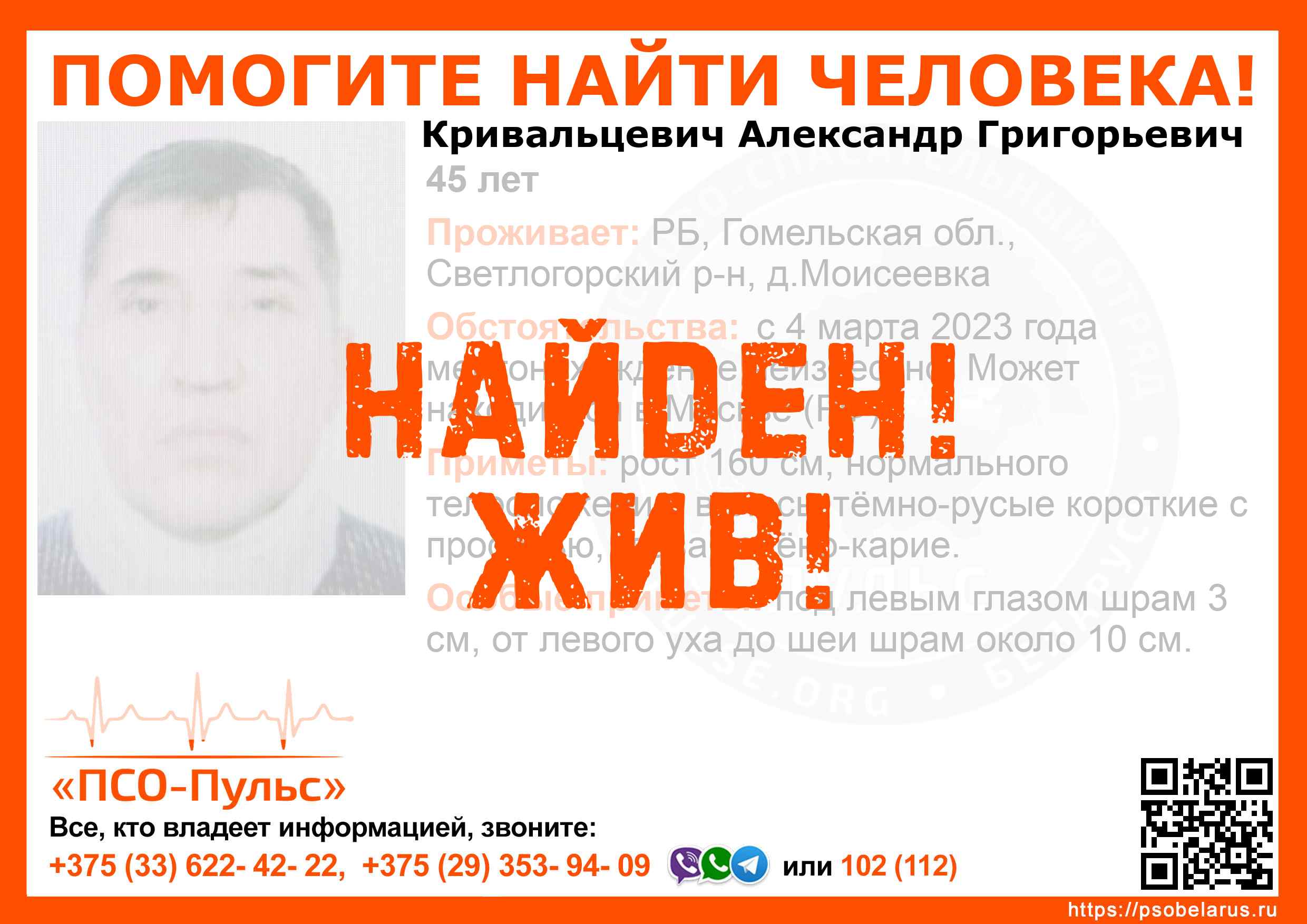 Всех, кто владеет информацией, просим сообщить: ПСО "ПСО-Пульс" +375(33)622-4222 |