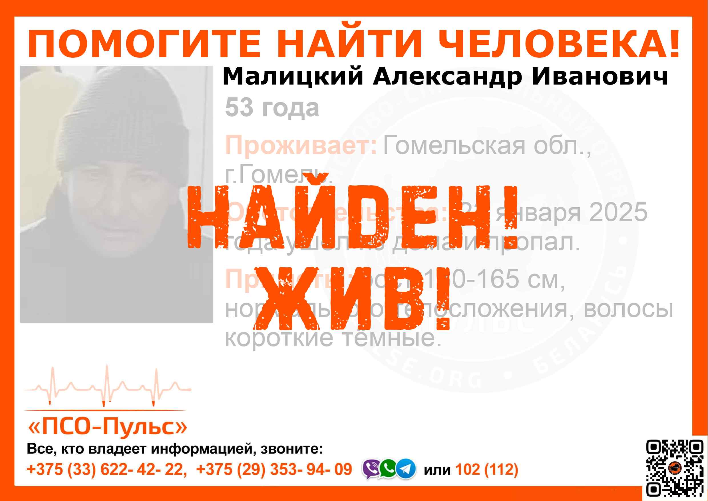 Всех, кто владеет информацией, просим сообщить: ПСО "ПСО-Пульс" +375(33)622-4222 |