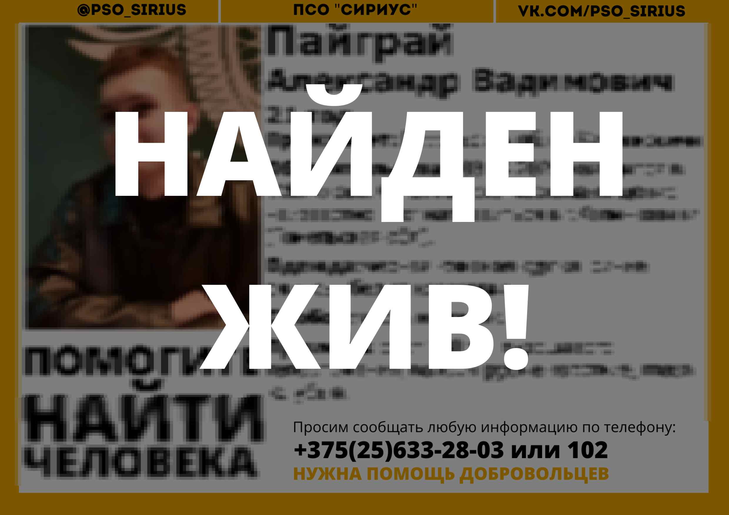 Всех, кто владеет информацией, просим сообщить: ПСО "Сириус" +375(25)633-28-03 |