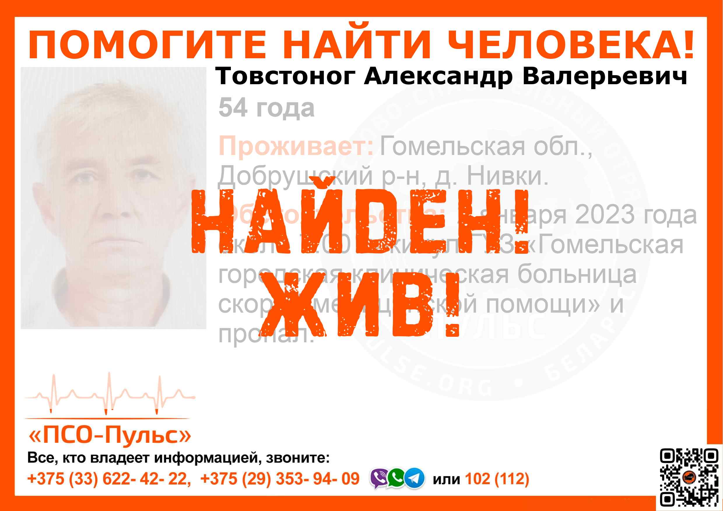 Всех, кто владеет информацией, просим сообщить: ПСО "ПСО-Пульс" +375(33)622-4222 |