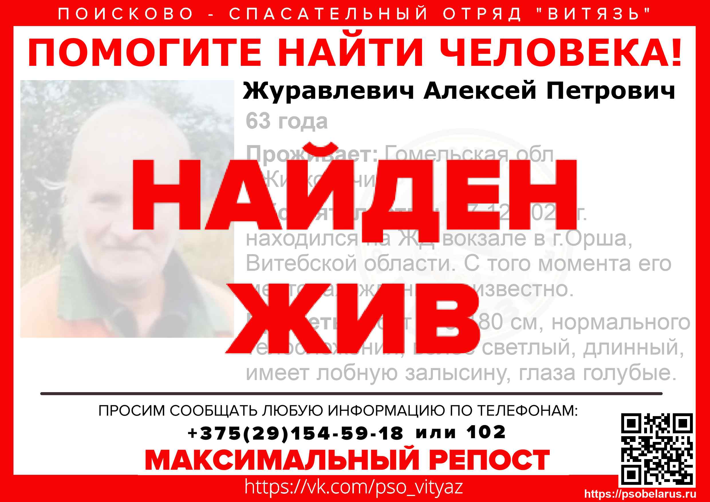 Всех, кто владеет информацией, просим сообщить: ПСО "ВИТЯЗЬ" +375(29)154-59-18 |