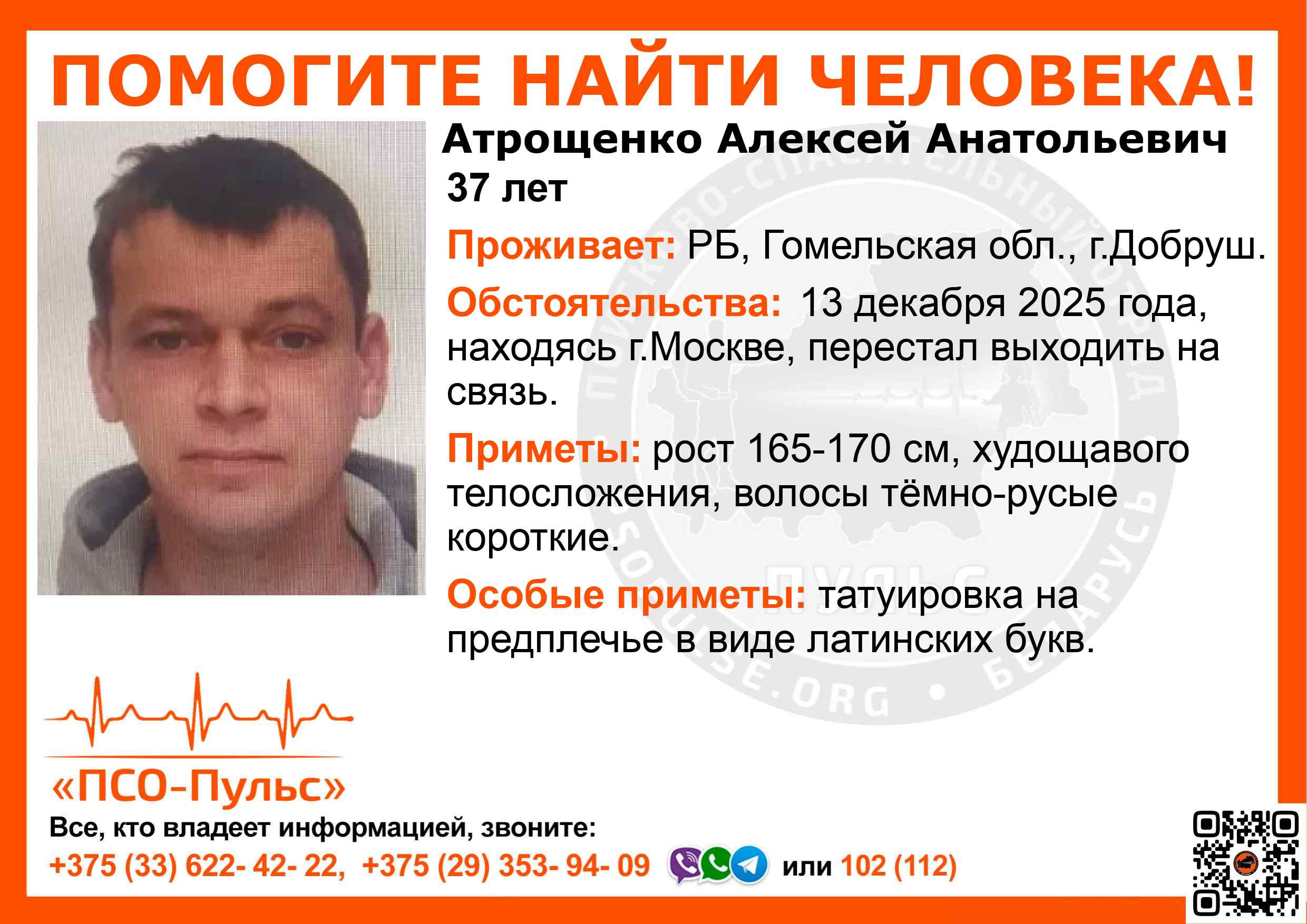 Всех, кто владеет информацией, просим сообщить: ПСО "ПСО-Пульс" +375(33)622-4222 |