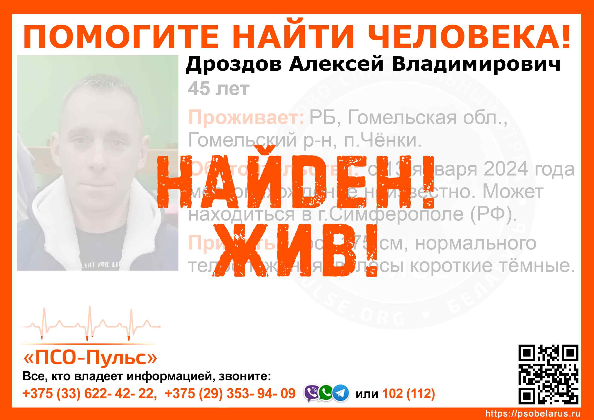 Всех, кто владеет информацией, просим сообщить: ПСО "ПСО-Пульс" +375(33)622-4222 |