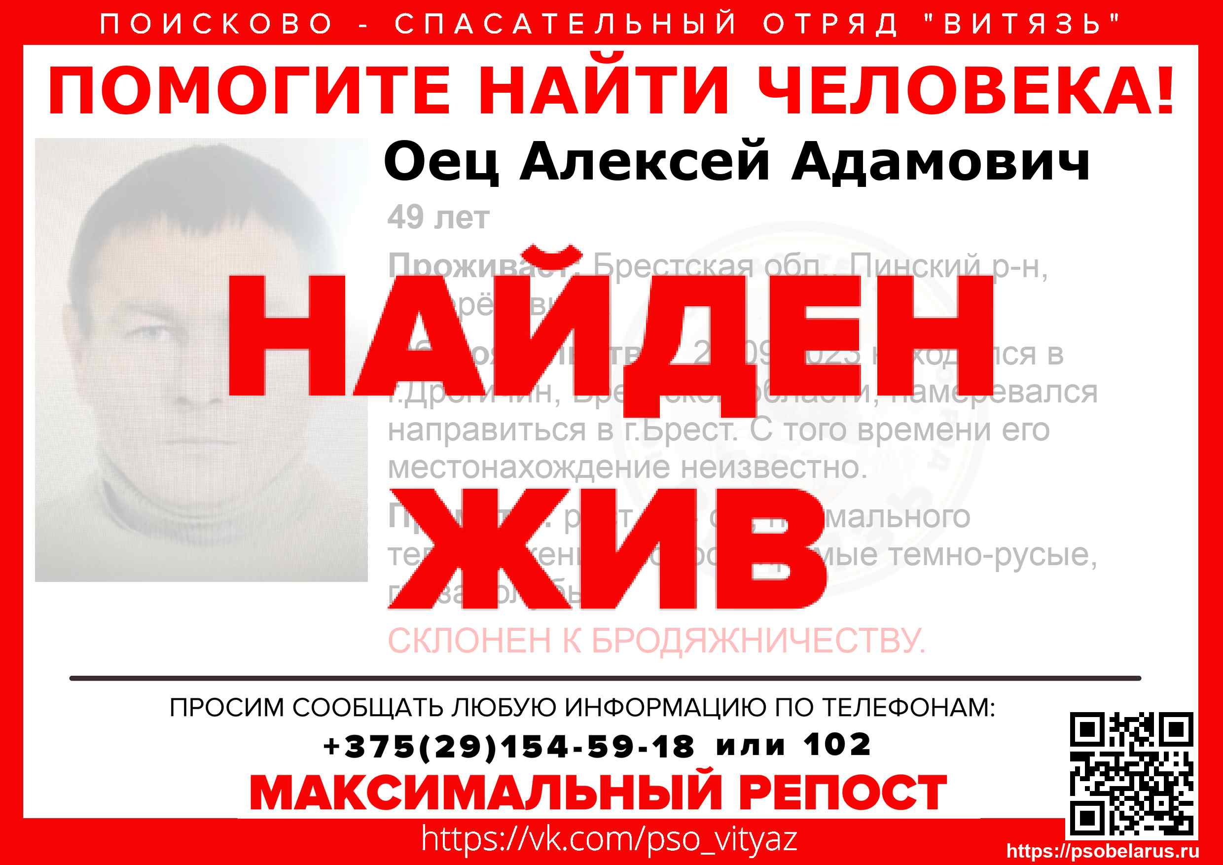 Всех, кто владеет информацией, просим сообщить: ПСО "ВИТЯЗЬ" +375(29)154-59-18 |