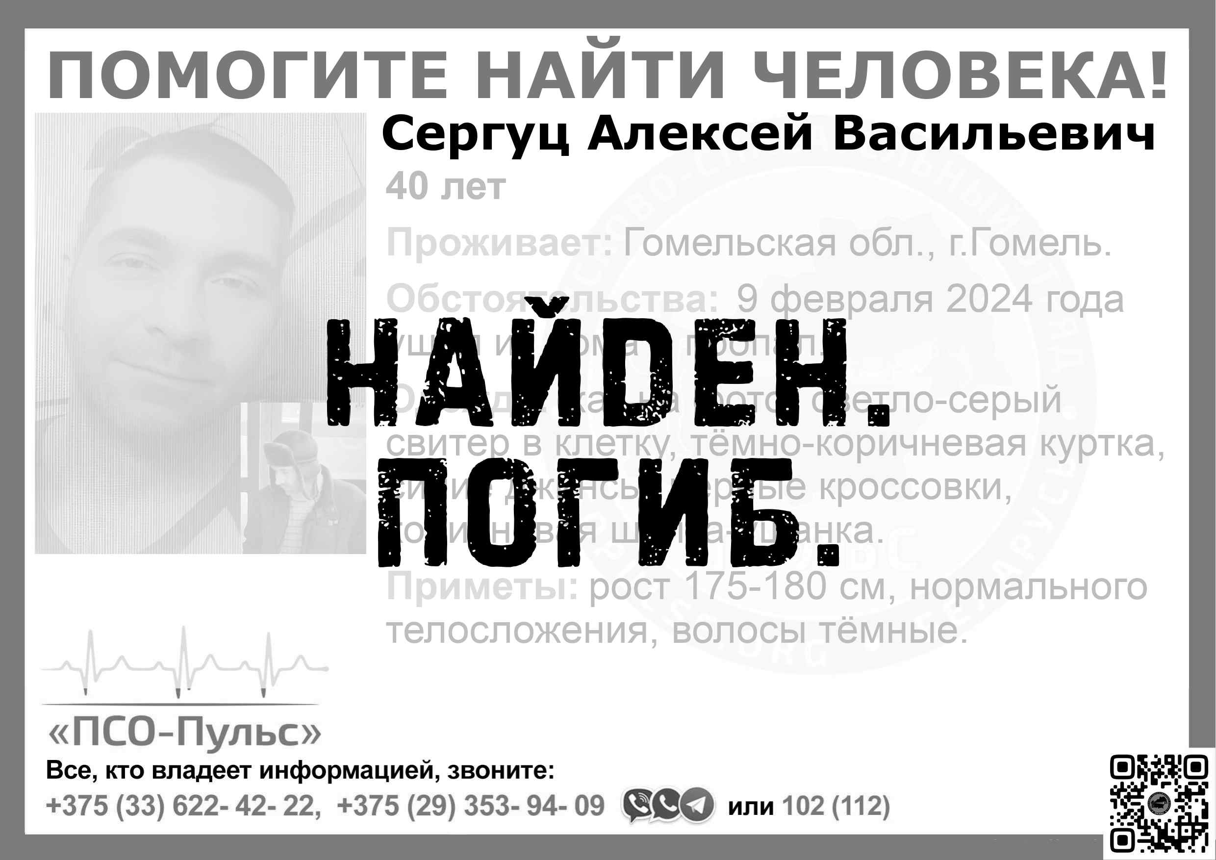 Всех, кто владеет информацией, просим сообщить: ПСО "ПСО-Пульс" +375(33)622-4222 |