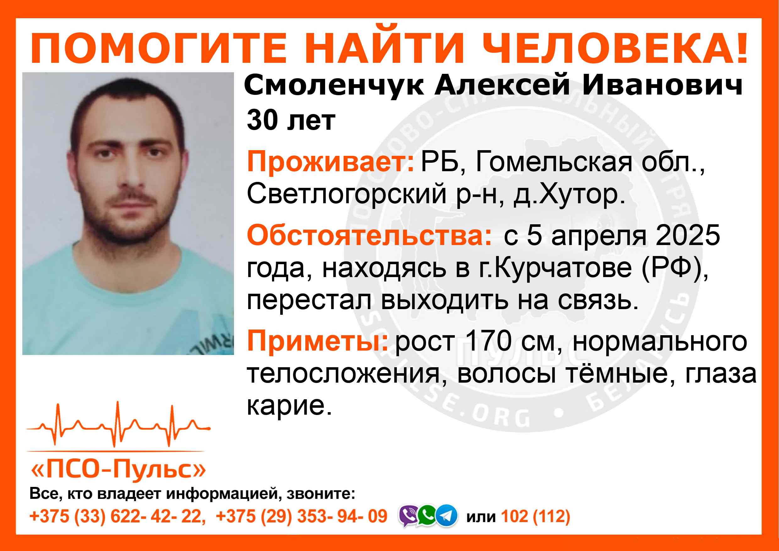 Всех, кто владеет информацией, просим сообщить: ПСО "ПСО-Пульс" +375(33)622-4222 |