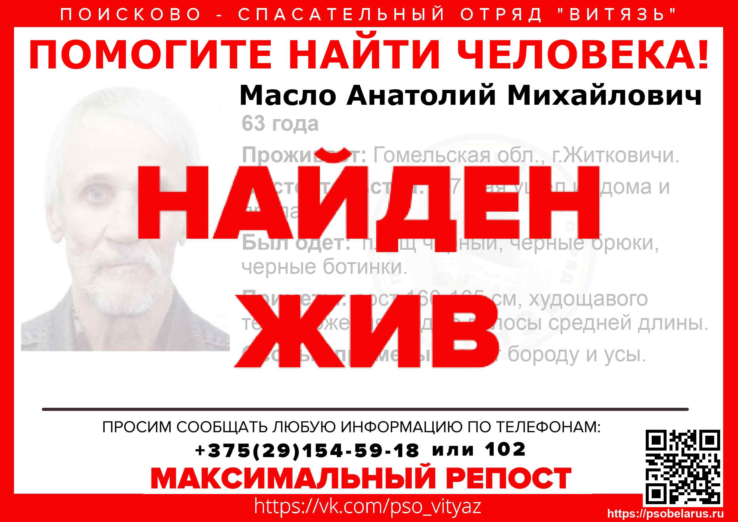 Всех, кто владеет информацией, просим сообщить: ПСО "ВИТЯЗЬ" +375(29)154-59-18 |