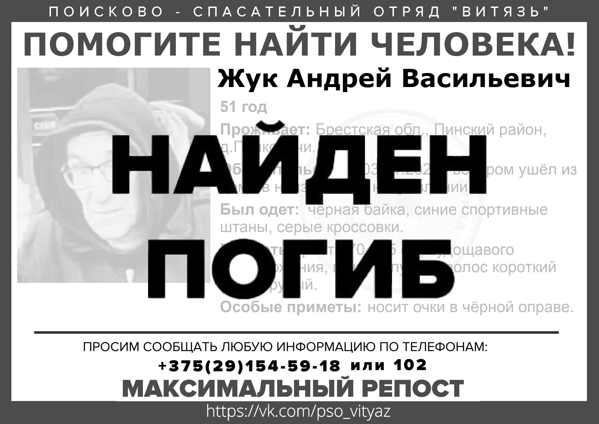 Всех, кто владеет информацией, просим сообщить: ПСО "ВИТЯЗЬ" +375(29)154-59-18 |