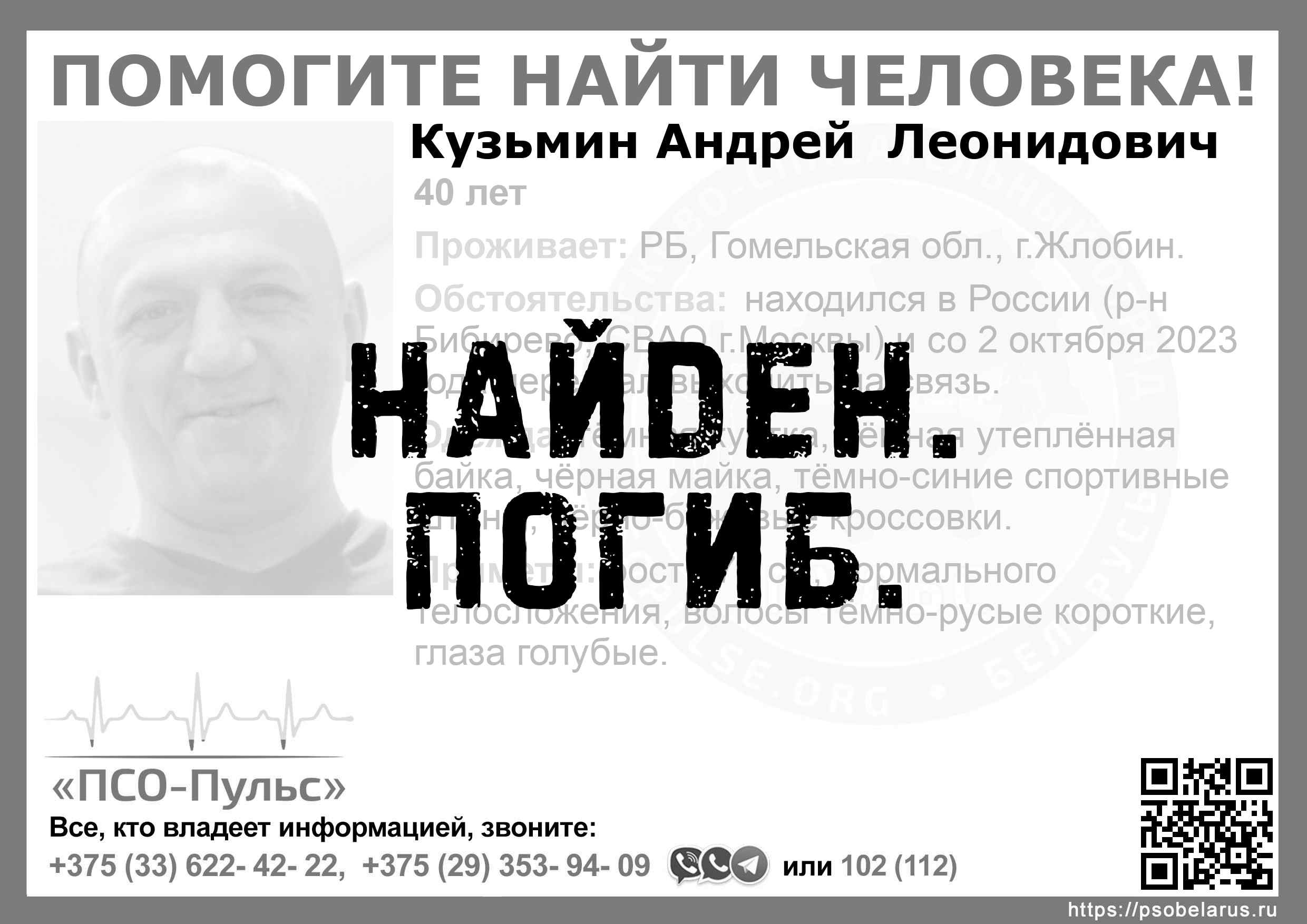 Всех, кто владеет информацией, просим сообщить: ПСО "ПСО-Пульс" +375(33)622-4222 |