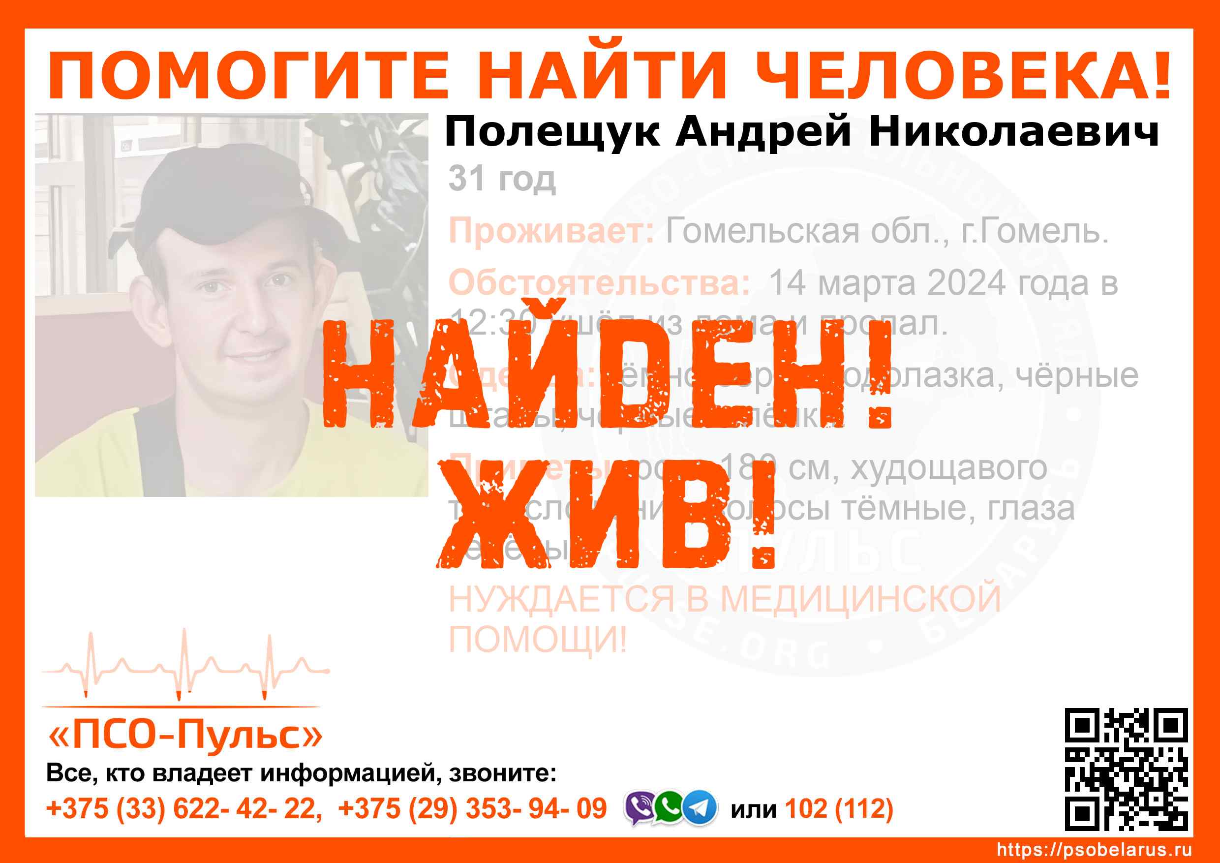 Всех, кто владеет информацией, просим сообщить: ПСО "ПСО-Пульс" +375(33)622-4222 |