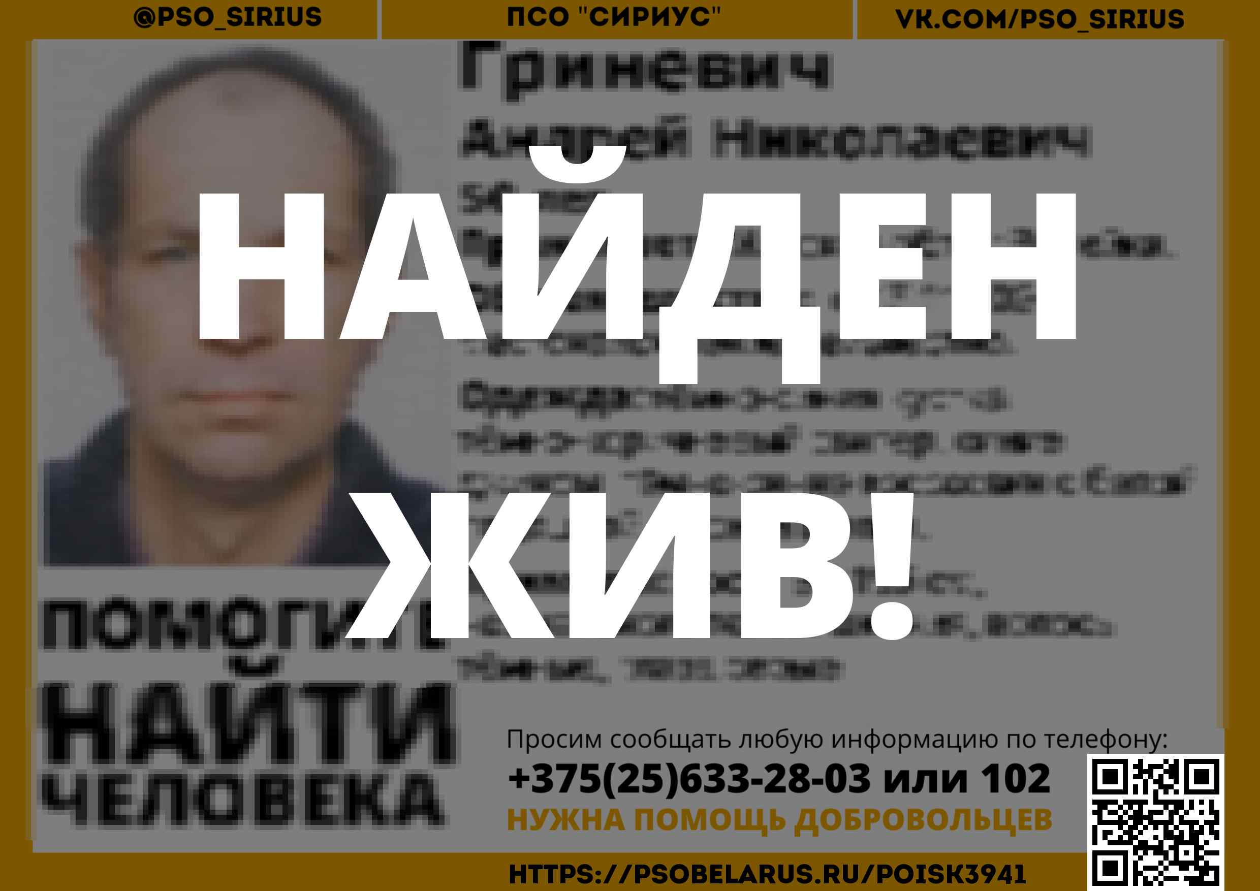 Всех, кто владеет информацией, просим сообщить: ПСО "Сириус" +375(25)633-28-03 |
