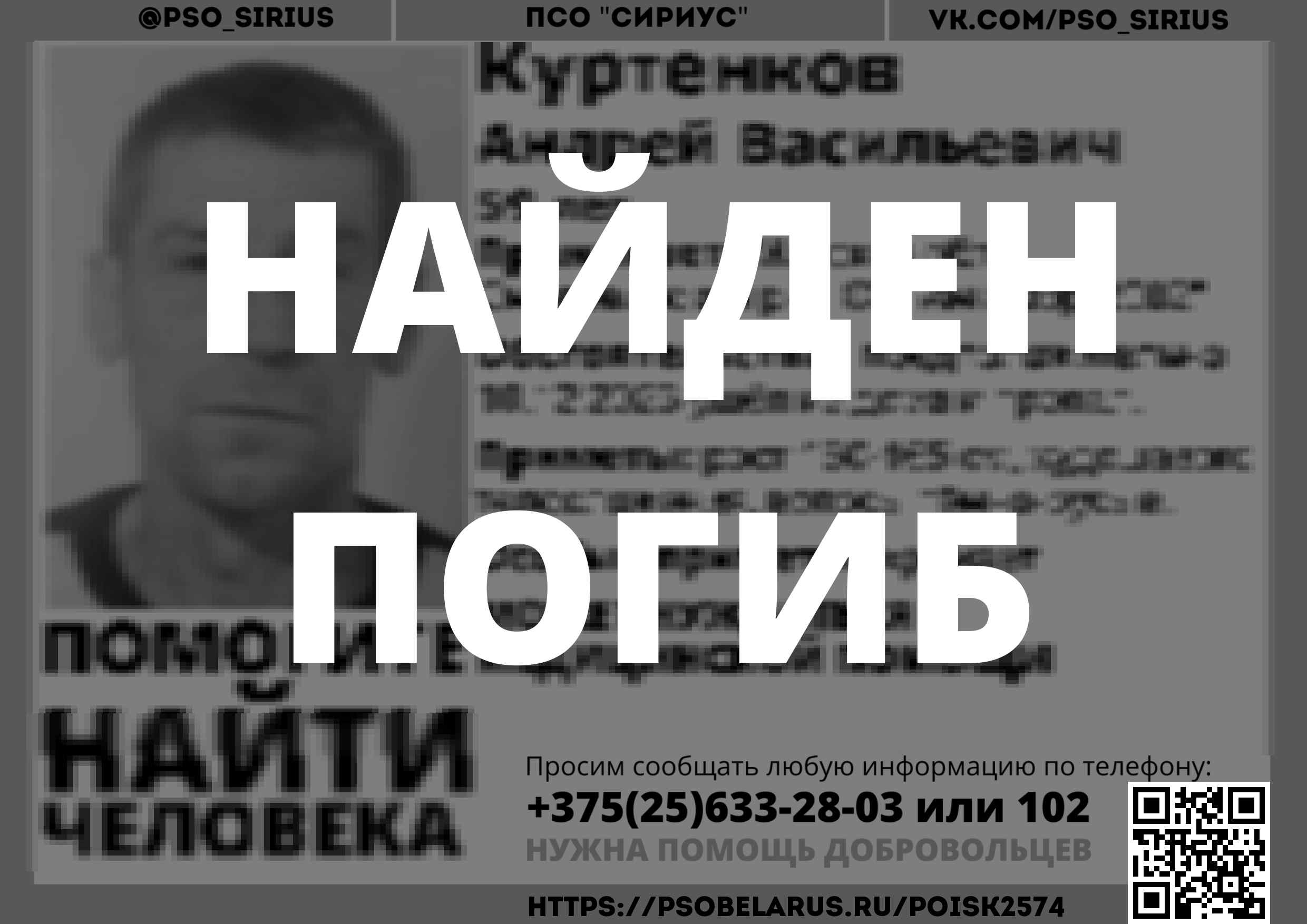 Всех, кто владеет информацией, просим сообщить: ПСО "Сириус" +375(25)633-28-03 |