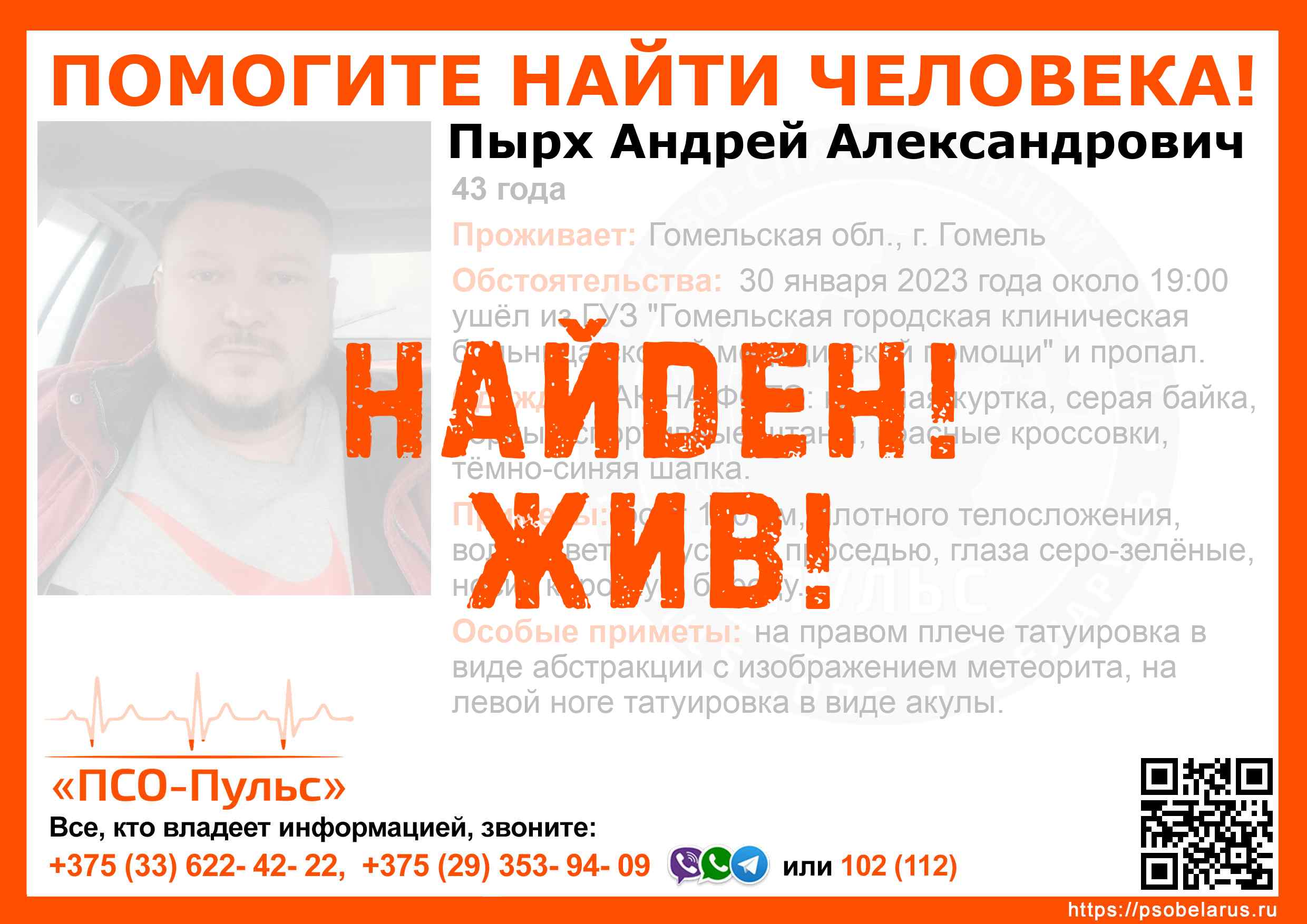 Всех, кто владеет информацией, просим сообщить: ПСО "ПСО-Пульс" +375(33)622-4222 |