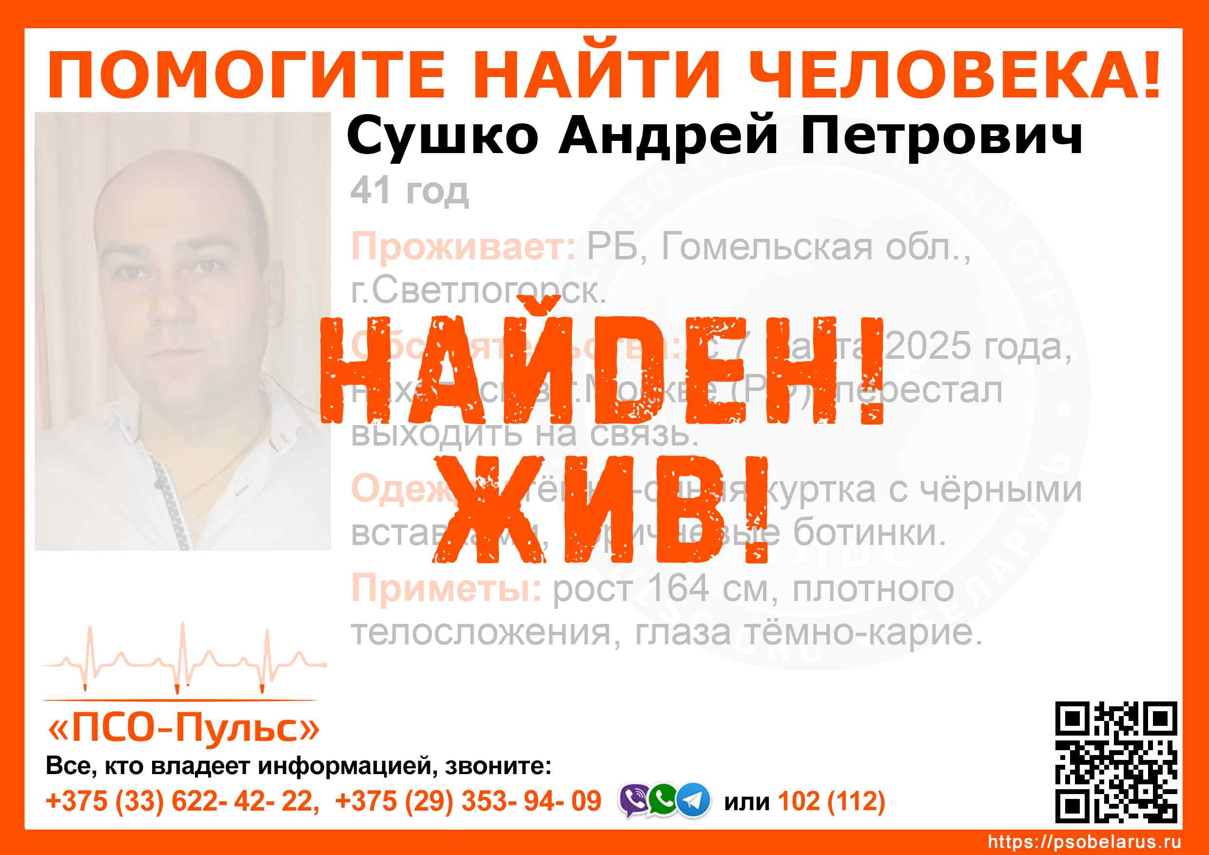 Всех, кто владеет информацией, просим сообщить: ПСО "ПСО-Пульс" +375(33)622-4222 |