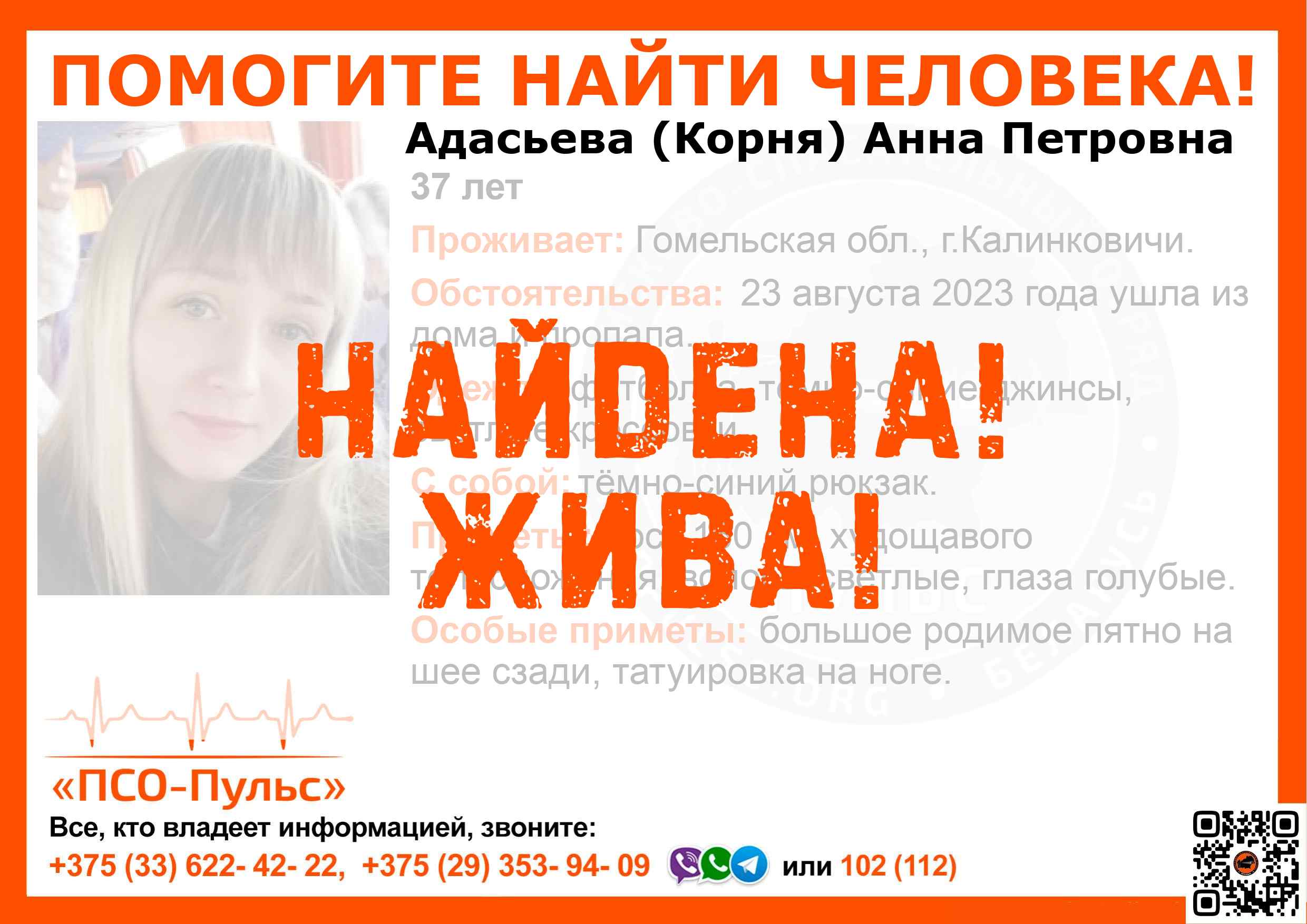 Всех, кто владеет информацией, просим сообщить: ПСО "ПСО-Пульс" +375(33)622-4222 |