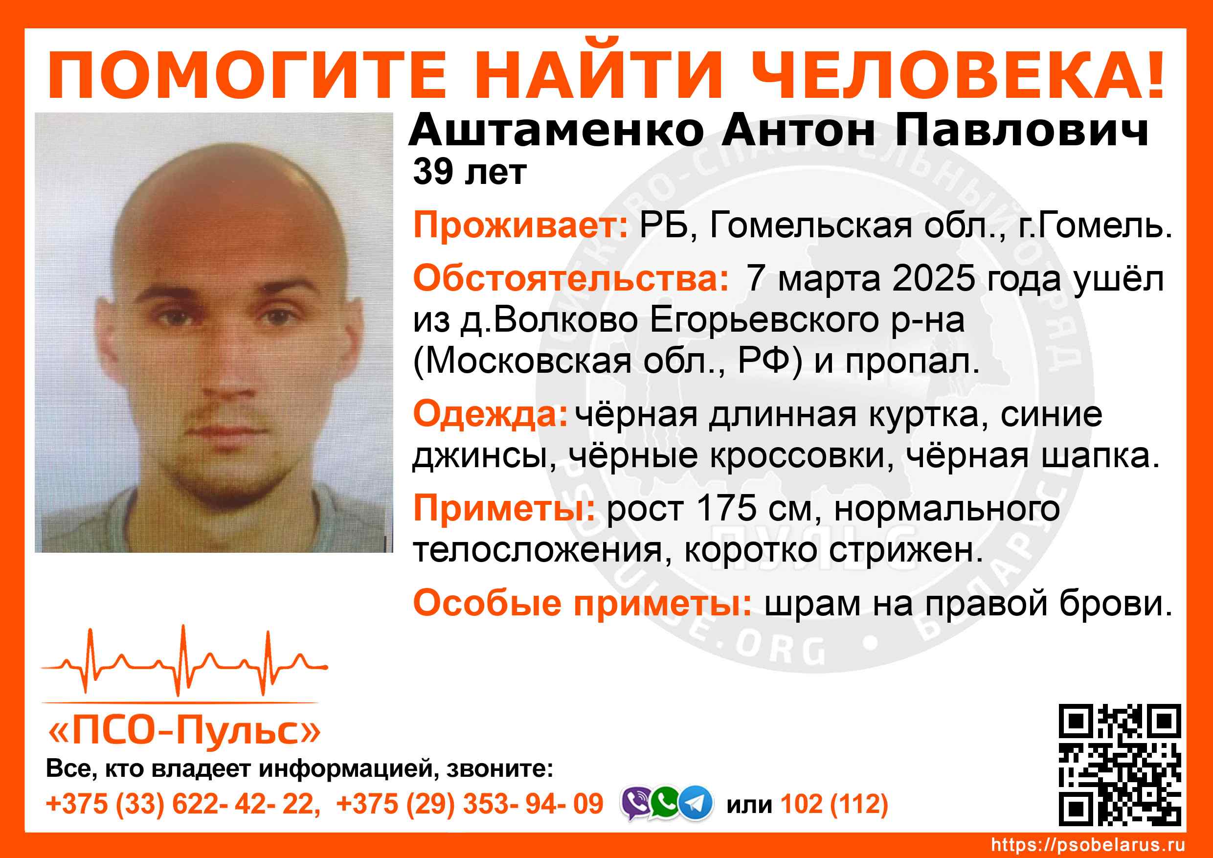 Всех, кто владеет информацией, просим сообщить: ПСО "ПСО-Пульс" +375(33)622-4222 |