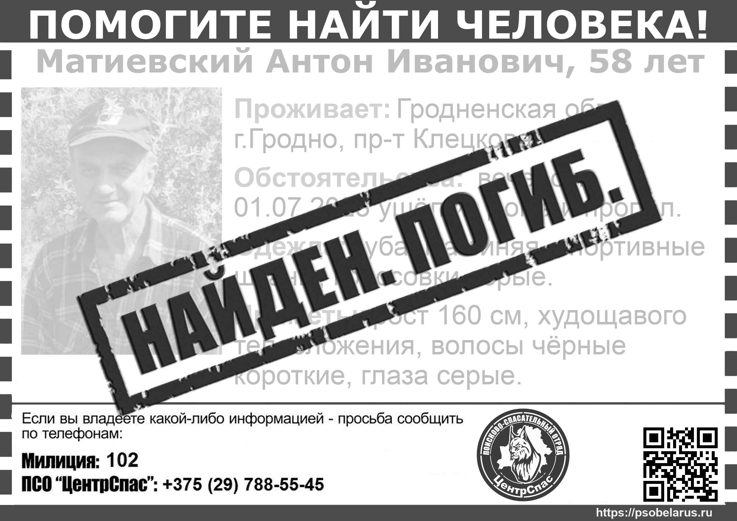 Всех, кто владеет информацией, просим сообщить: ПСО "ЦентрСпас" +375(29)788-5545 |