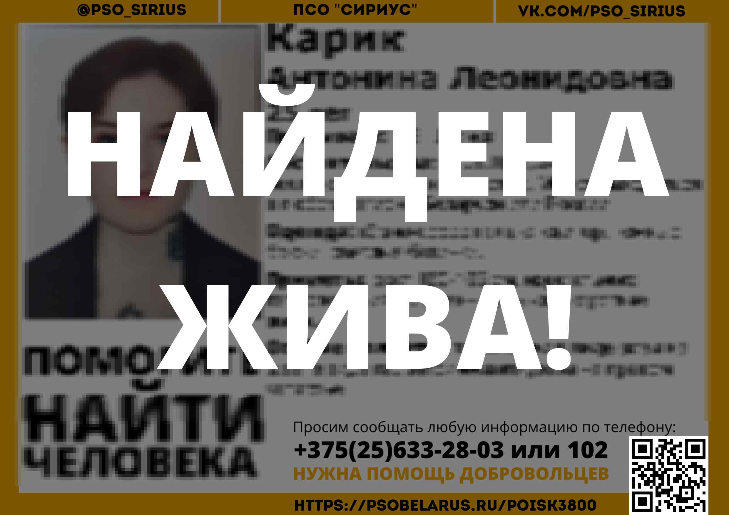 Всех, кто владеет информацией, просим сообщить: ПСО "Сириус" +375(25)633-28-03 |