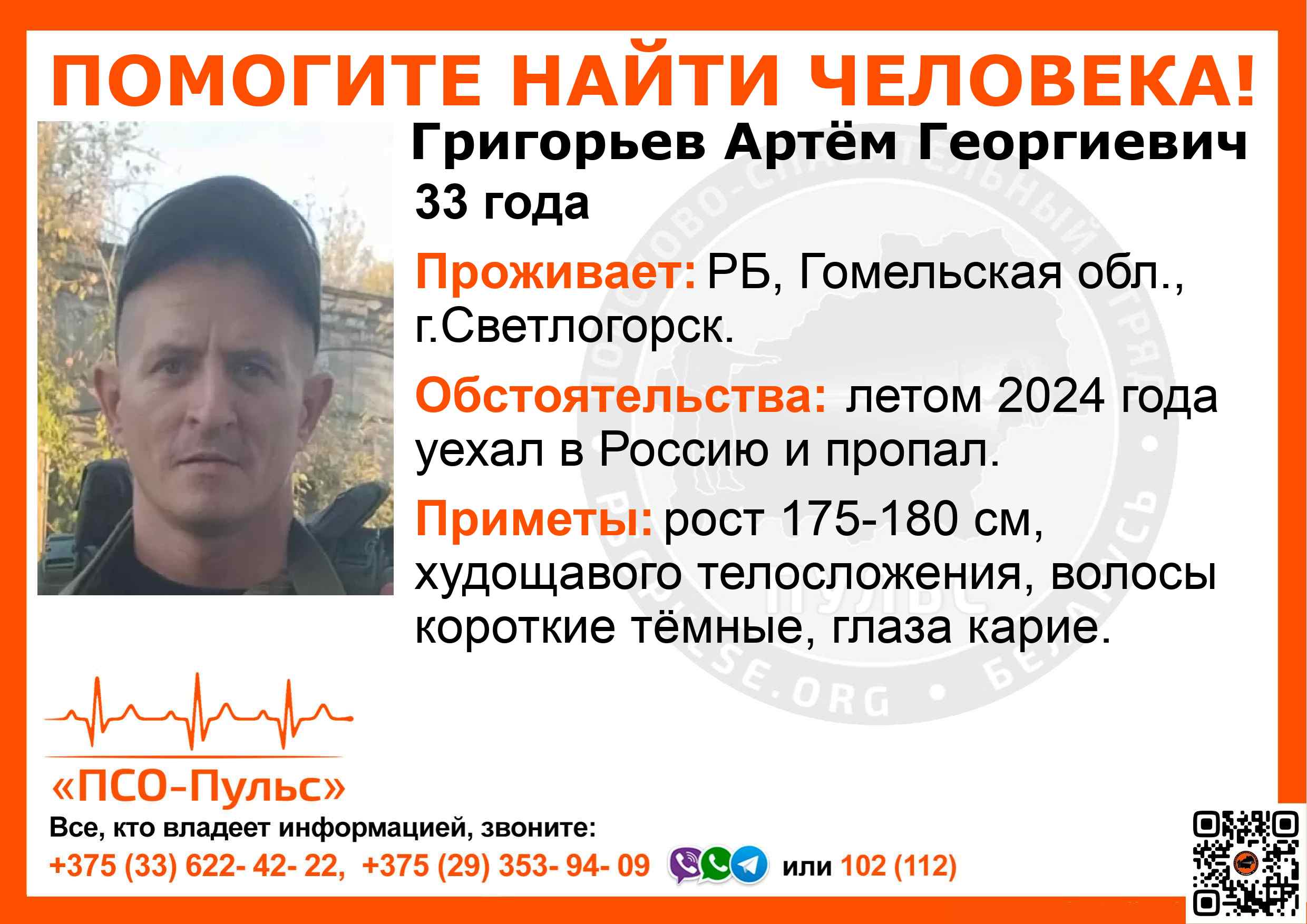 Всех, кто владеет информацией, просим сообщить: ПСО "ПСО-Пульс" +375(33)622-4222 |