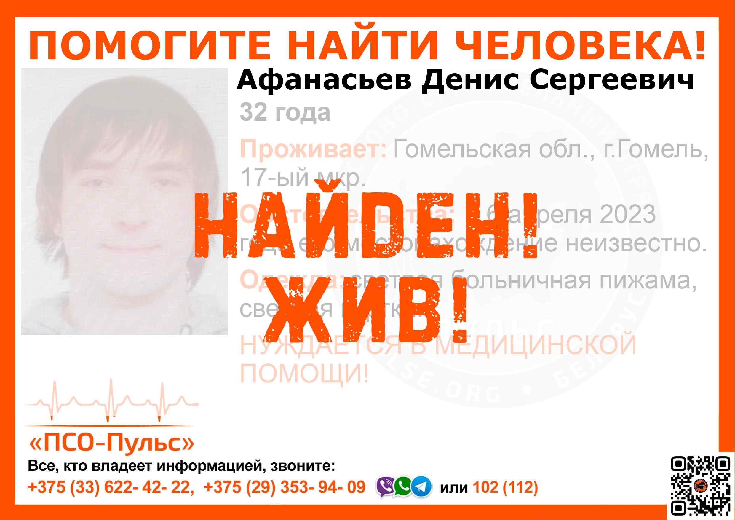 Всех, кто владеет информацией, просим сообщить: ПСО "ПСО-Пульс" +375(33)622-4222 |