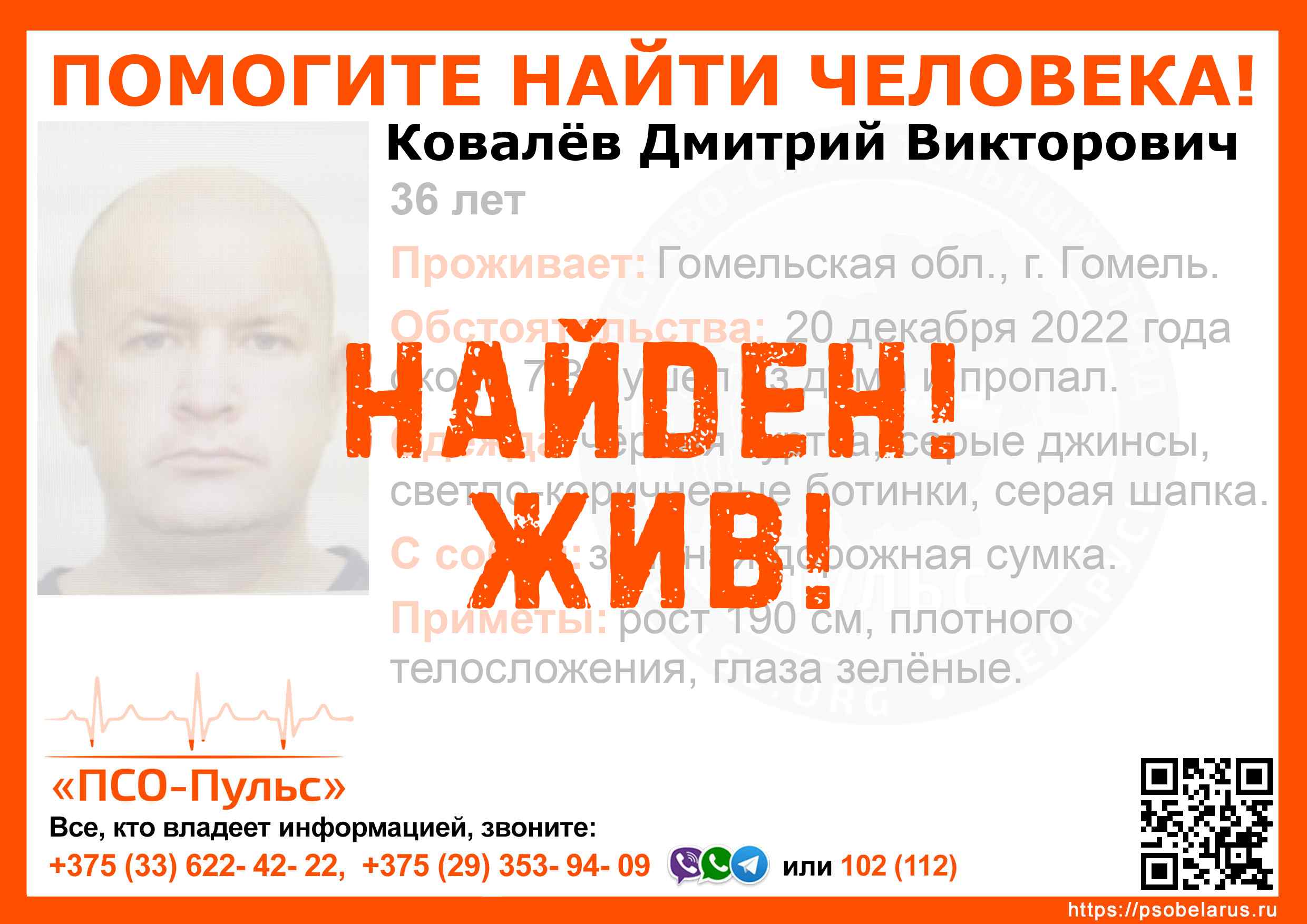 Всех, кто владеет информацией, просим сообщить: ПСО "ПСО-Пульс" +375(33)622-4222 |
