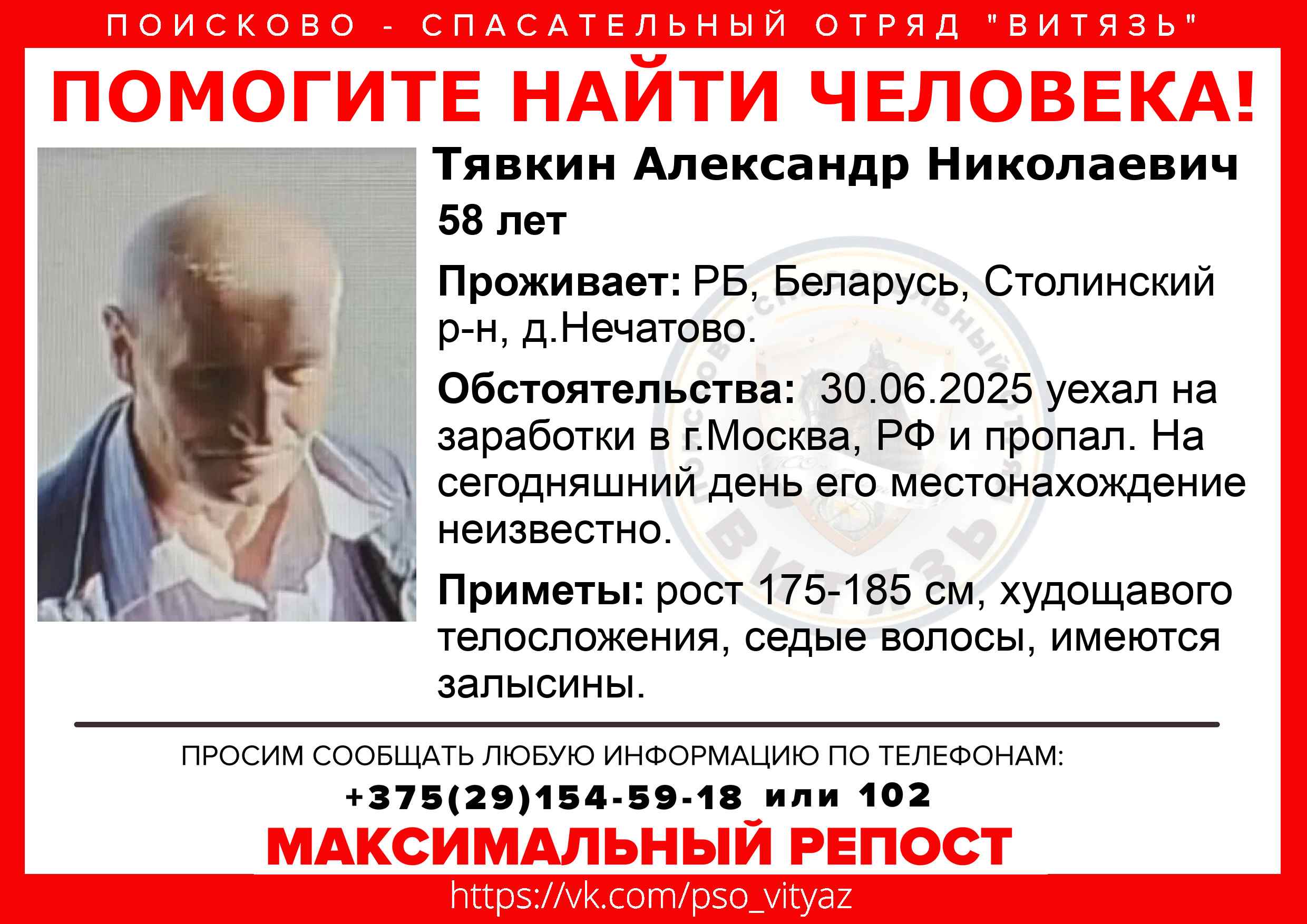 Всех, кто владеет информацией, просим сообщить: ПСО "ВИТЯЗЬ" +375(29)154-59-18 |
