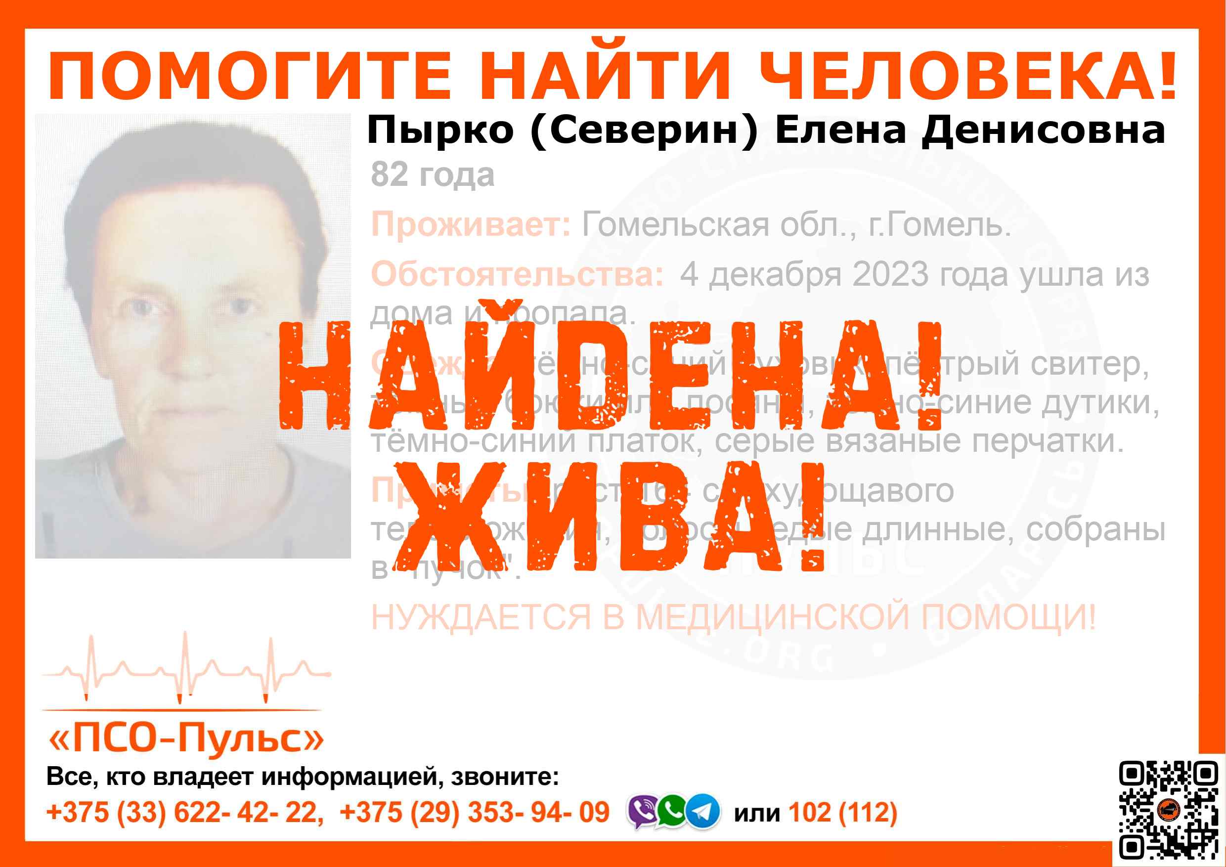 Всех, кто владеет информацией, просим сообщить: ПСО "ПСО-Пульс" +375(33)622-4222 |