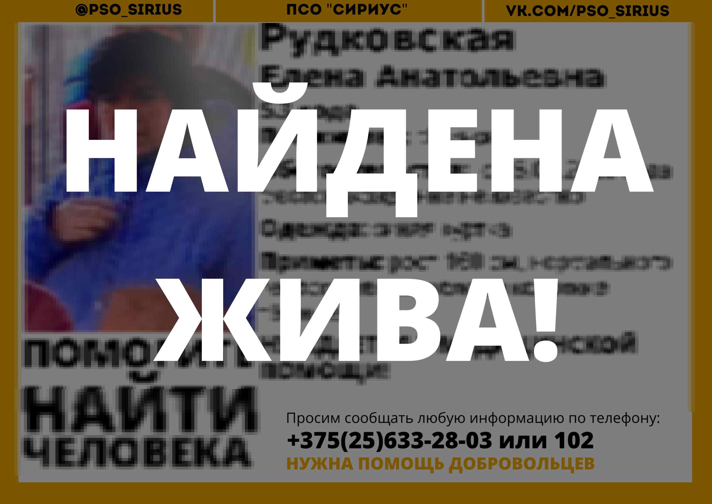 Всех, кто владеет информацией, просим сообщить: ПСО "Сириус" +375(25)633-28-03 |