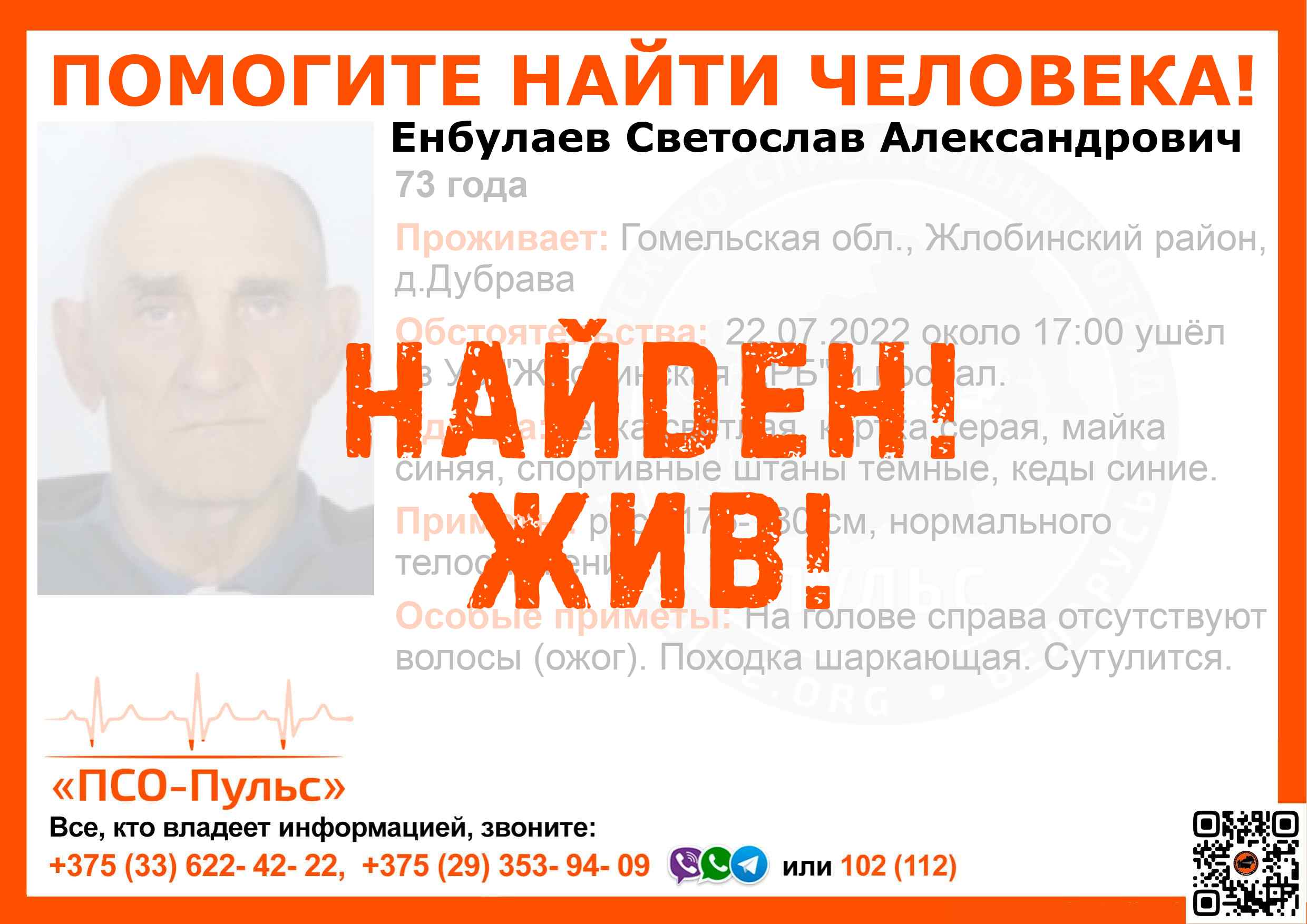 Всех, кто владеет информацией, просим сообщить: ПСО "ПСО-Пульс" +375(33)622-4222 |