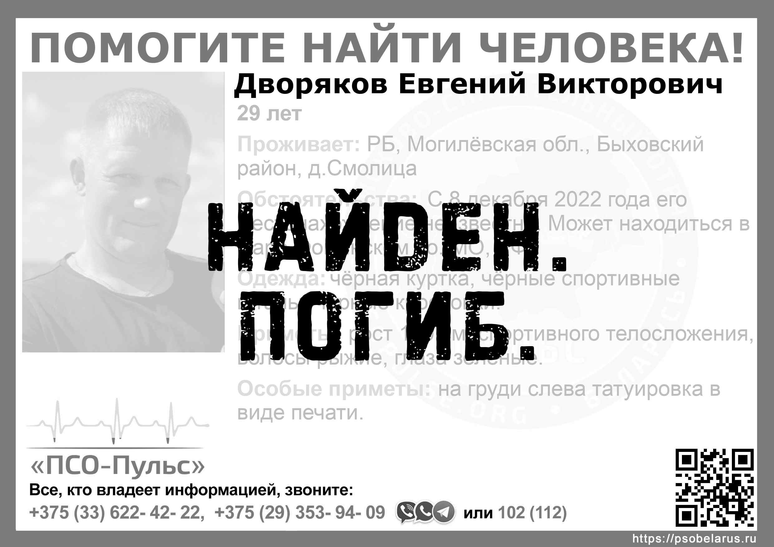 Всех, кто владеет информацией, просим сообщить: ПСО "ПСО-Пульс" +375(33)622-4222 |