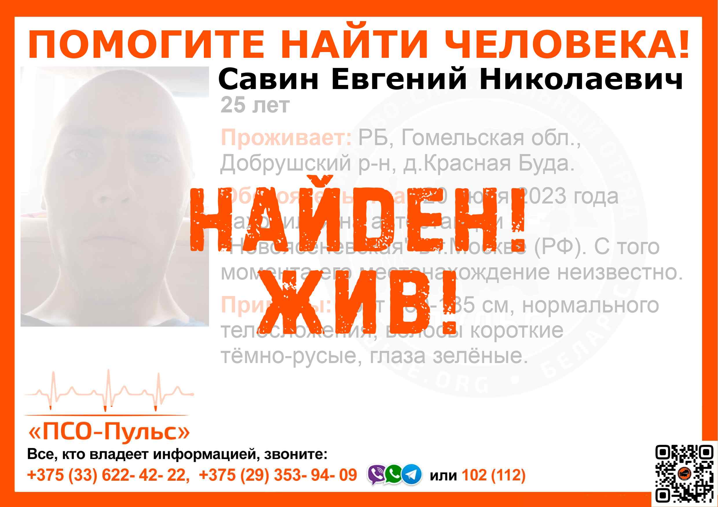 Всех, кто владеет информацией, просим сообщить: ПСО "ПСО-Пульс" +375(33)622-4222 |