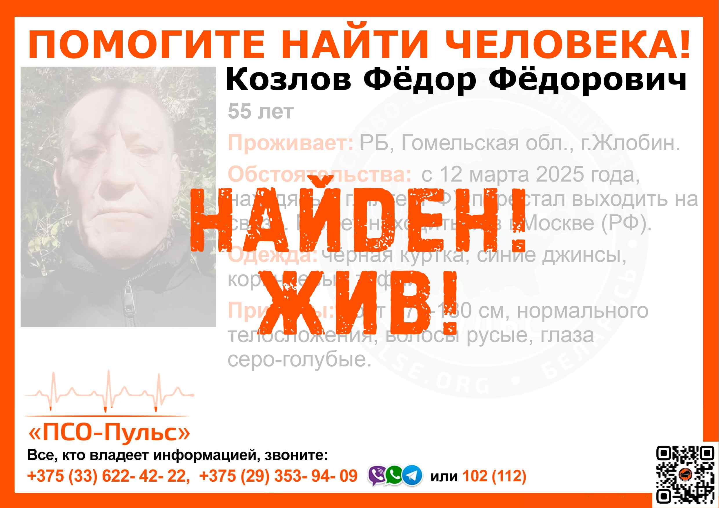 Всех, кто владеет информацией, просим сообщить: ПСО "ПСО-Пульс" +375(33)622-4222 |
