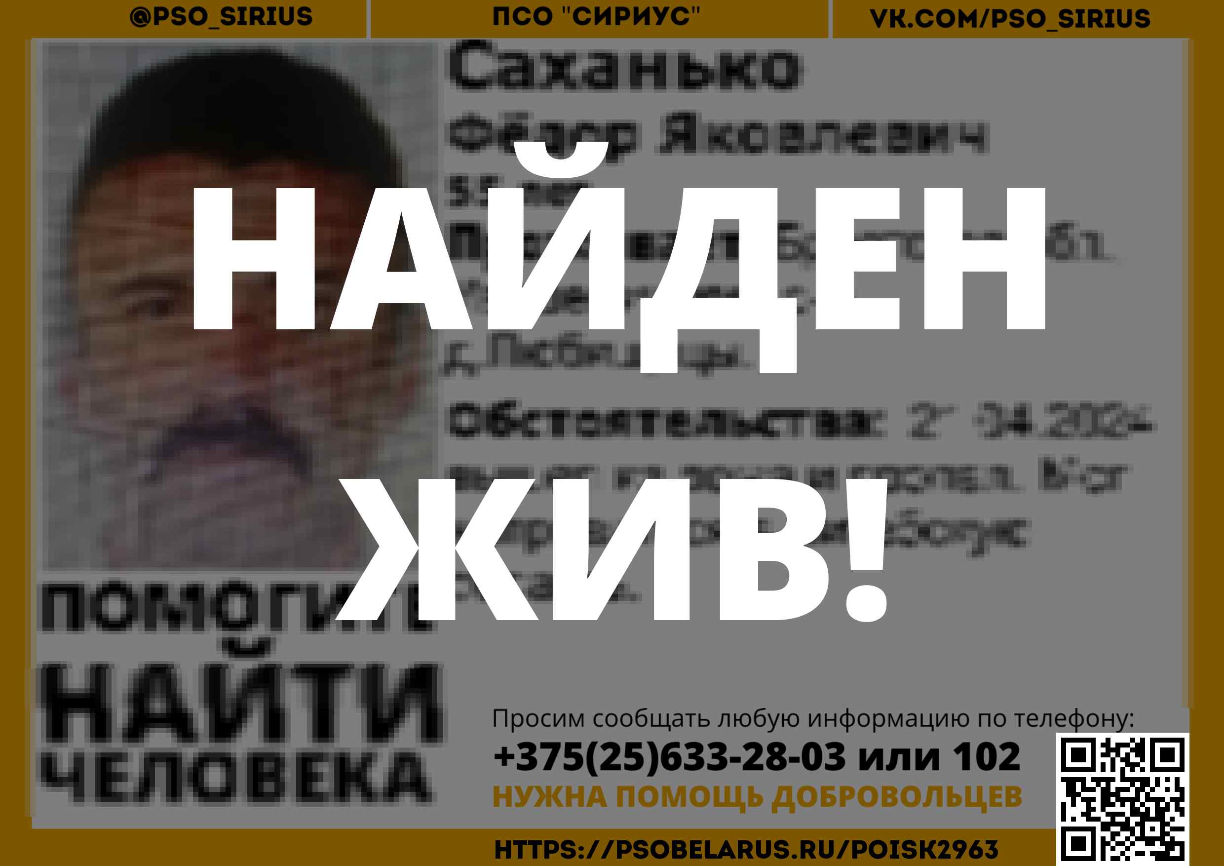 Всех, кто владеет информацией, просим сообщить: ПСО "Сириус" +375(25)633-28-03 |