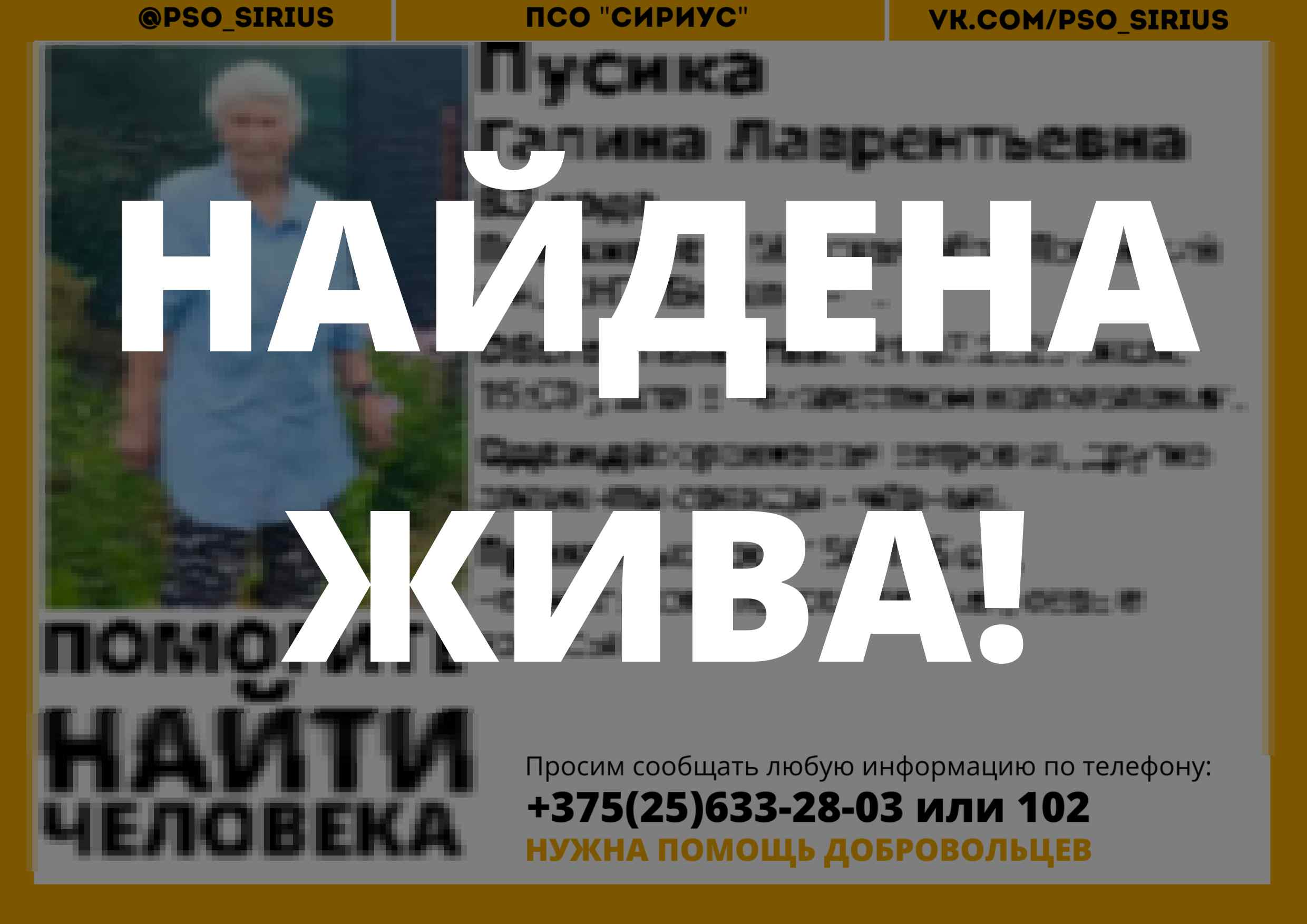 Всех, кто владеет информацией, просим сообщить: ПСО "Сириус" +375(25)633-28-03 |