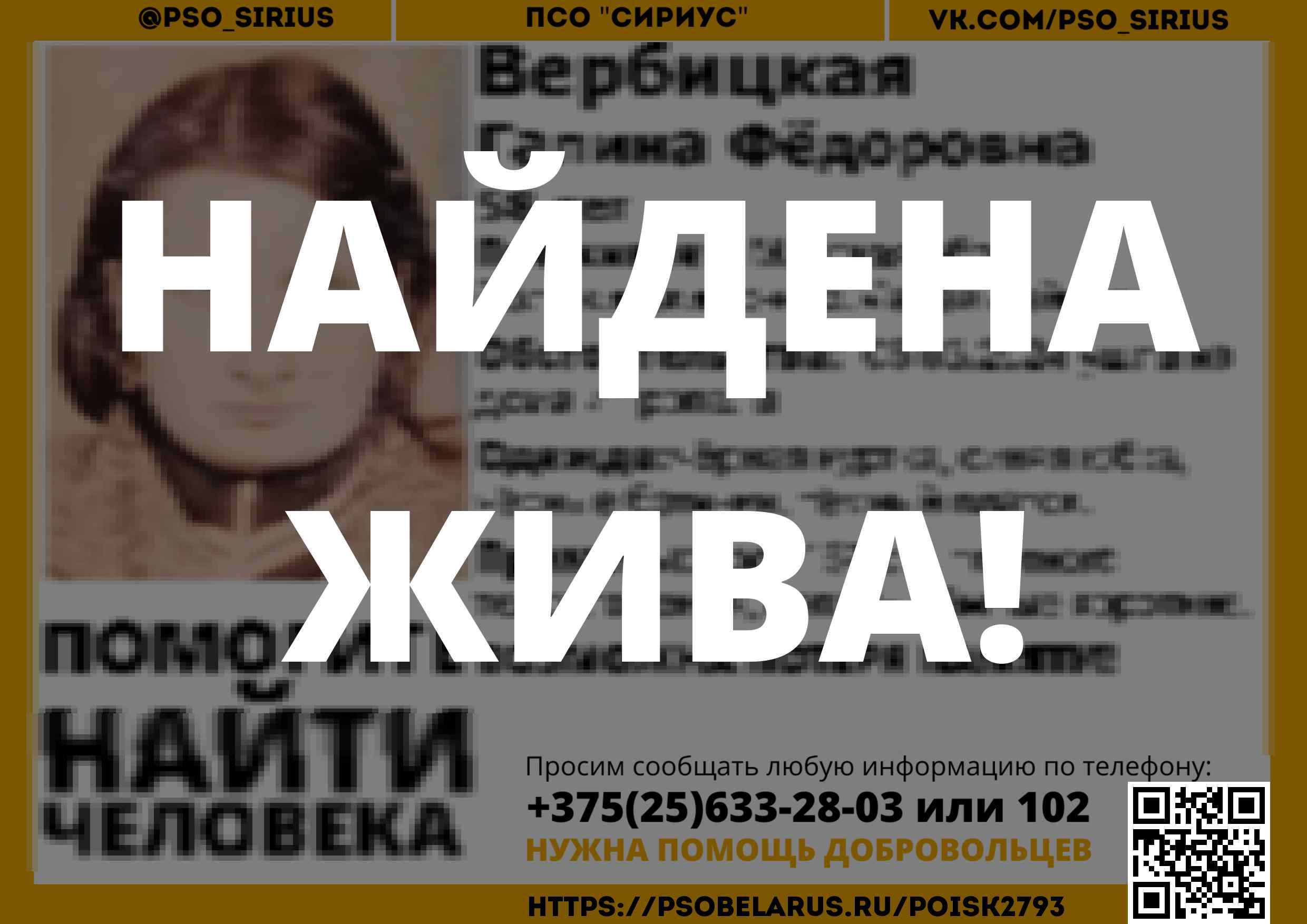 Всех, кто владеет информацией, просим сообщить: ПСО "Сириус" +375(25)633-28-03 |