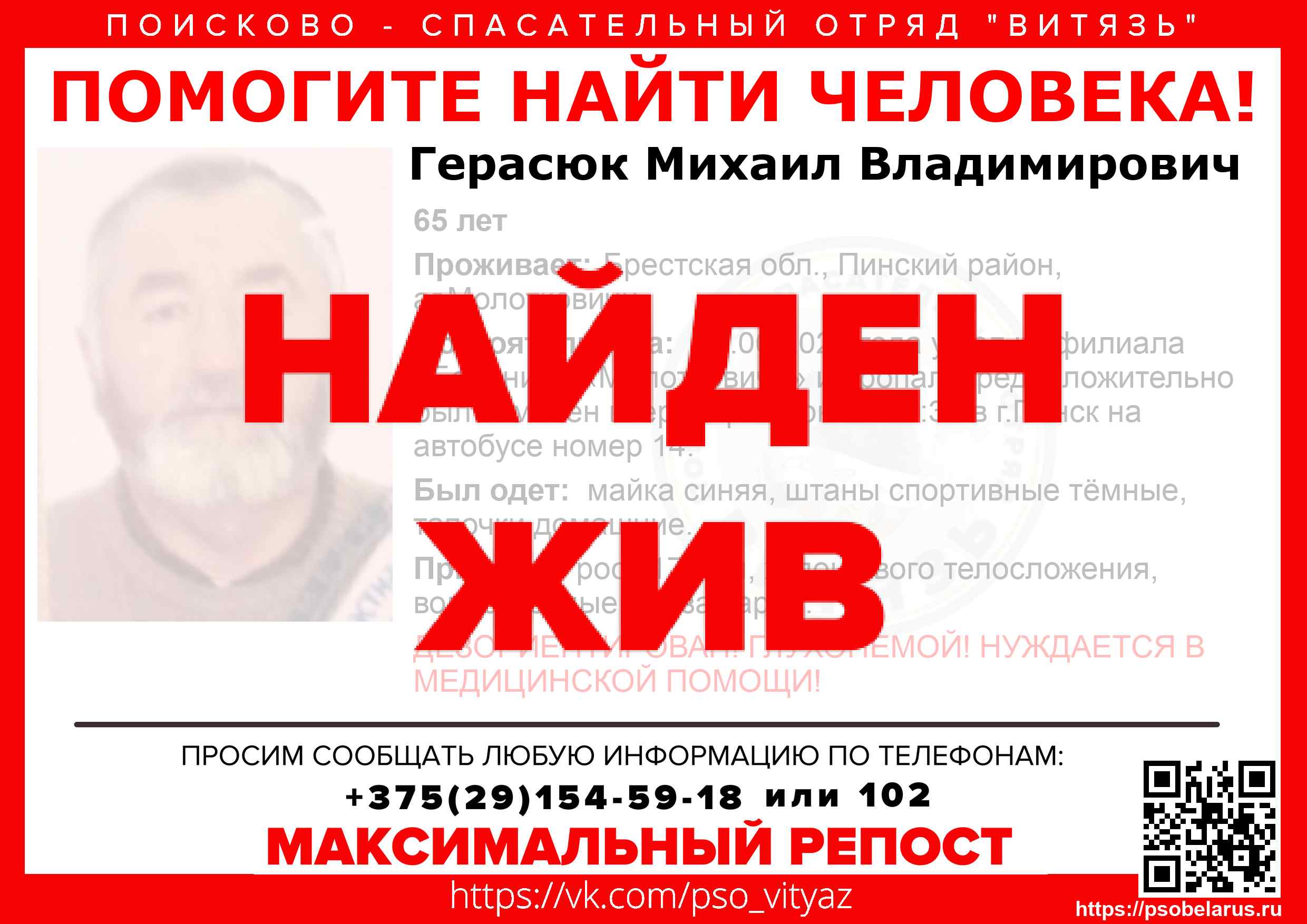 Всех, кто владеет информацией, просим сообщить: ПСО "ВИТЯЗЬ" +375(29)154-59-18 |