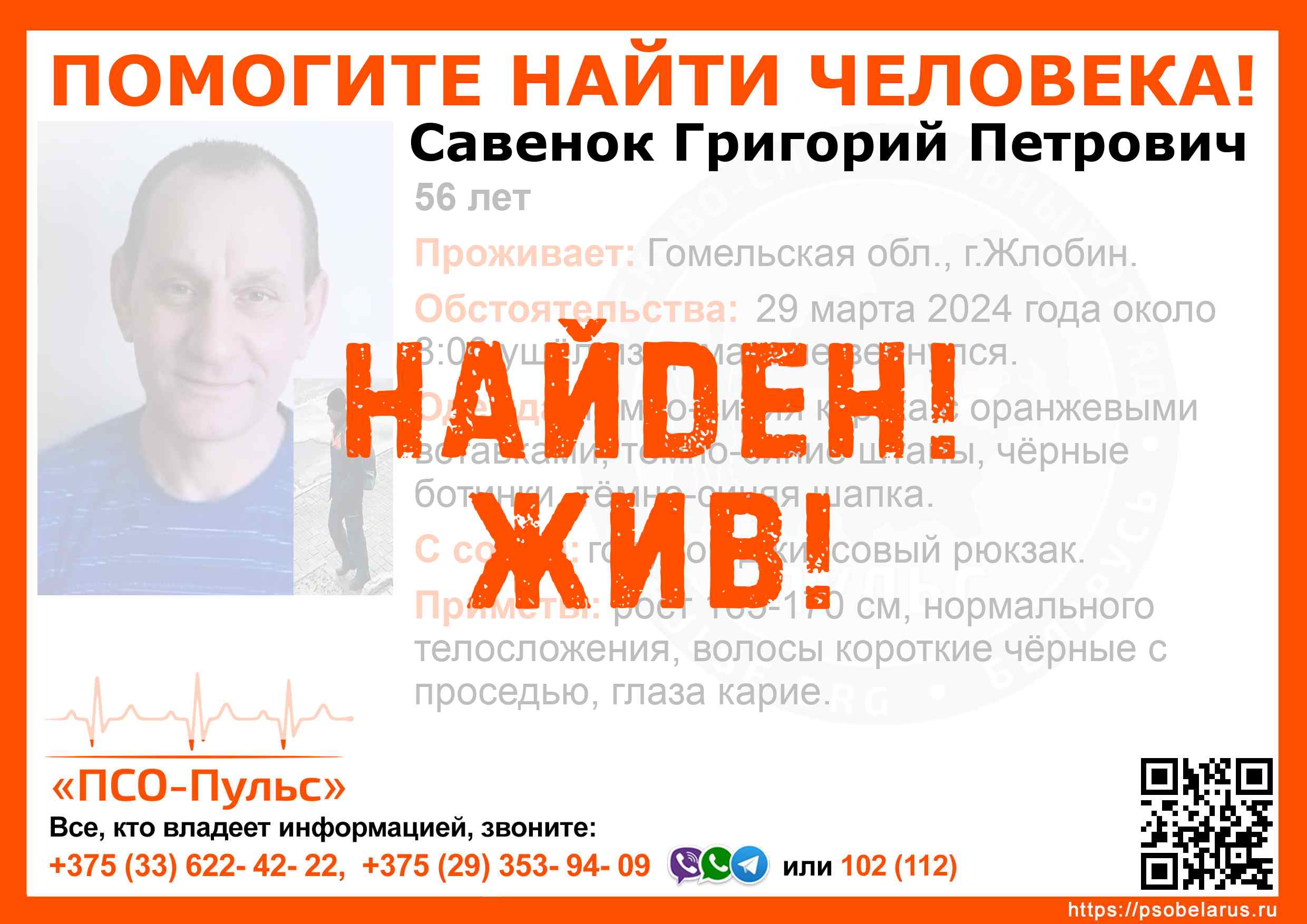 Всех, кто владеет информацией, просим сообщить: ПСО "ПСО-Пульс" +375(33)622-4222 |