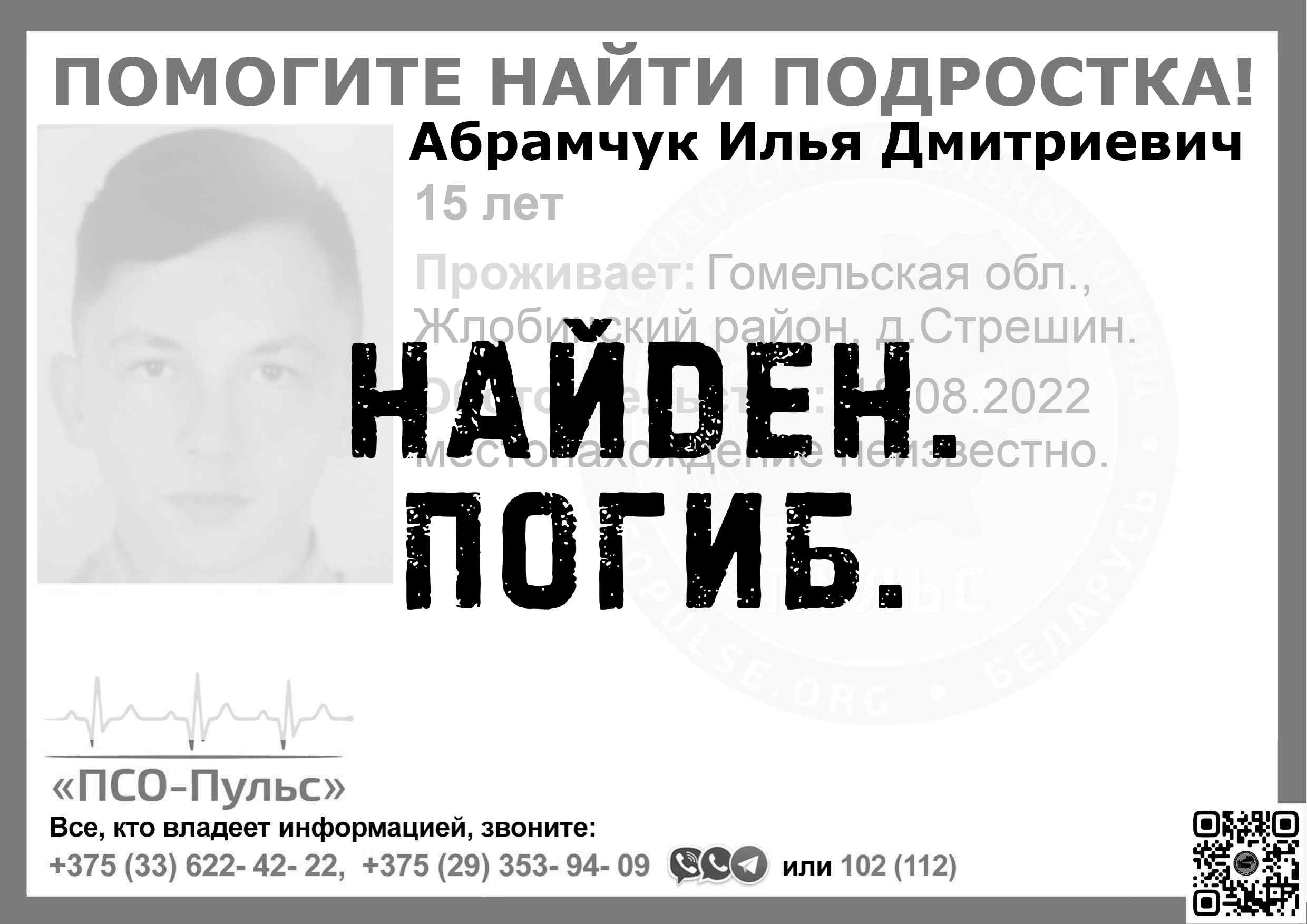 Всех, кто владеет информацией, просим сообщить: ПСО "ПСО-Пульс" +375(33)622-4222 |
