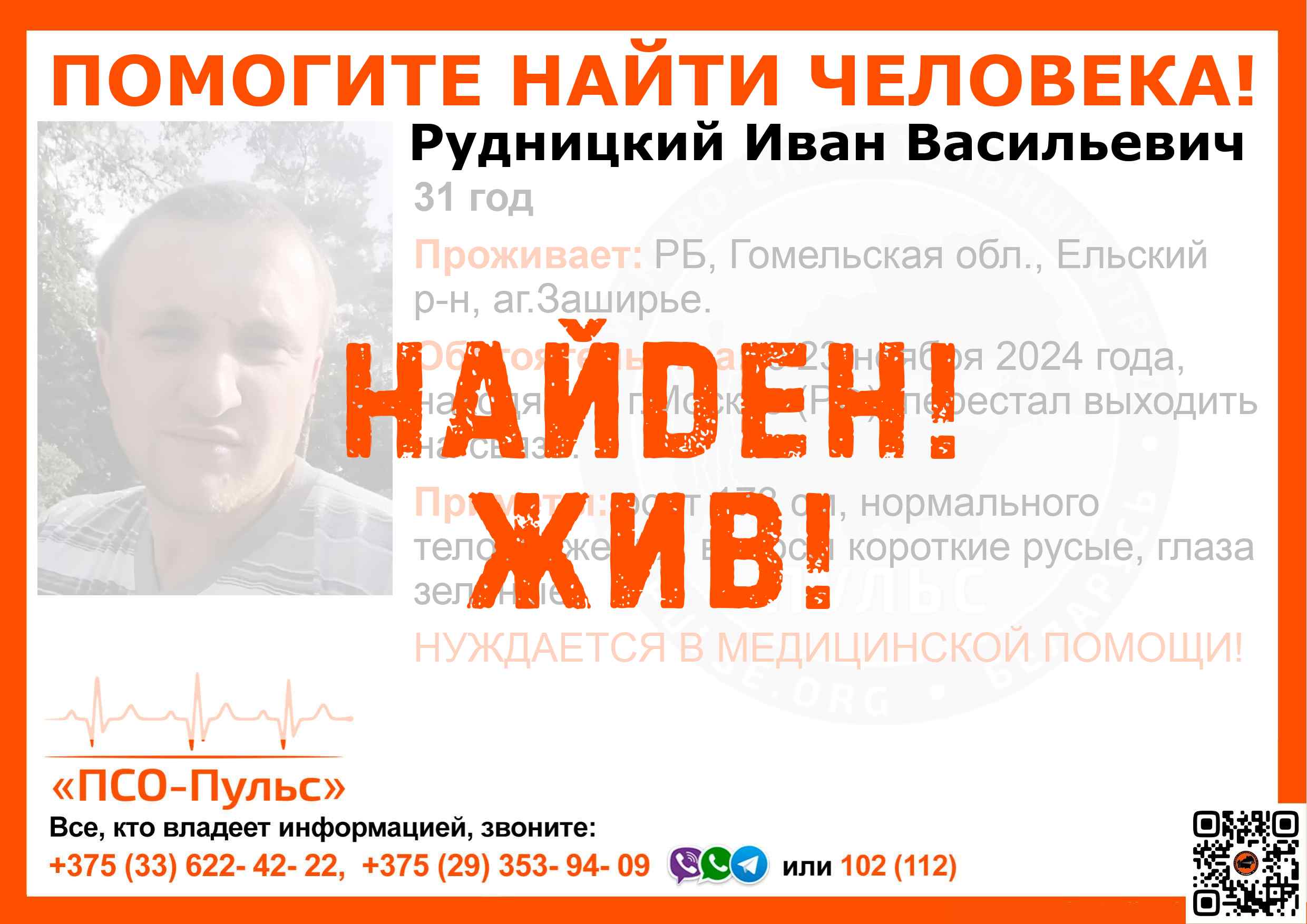 Всех, кто владеет информацией, просим сообщить: ПСО "ПСО-Пульс" +375(33)622-4222 |