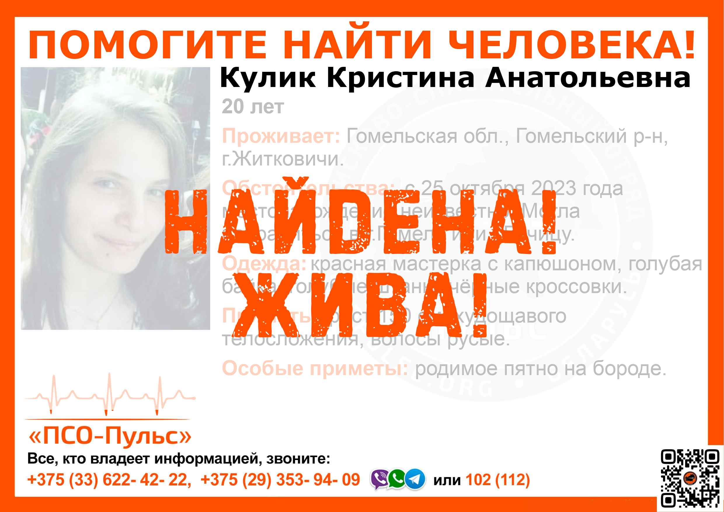 Всех, кто владеет информацией, просим сообщить: ПСО "ПСО-Пульс" +375(33)622-4222 |