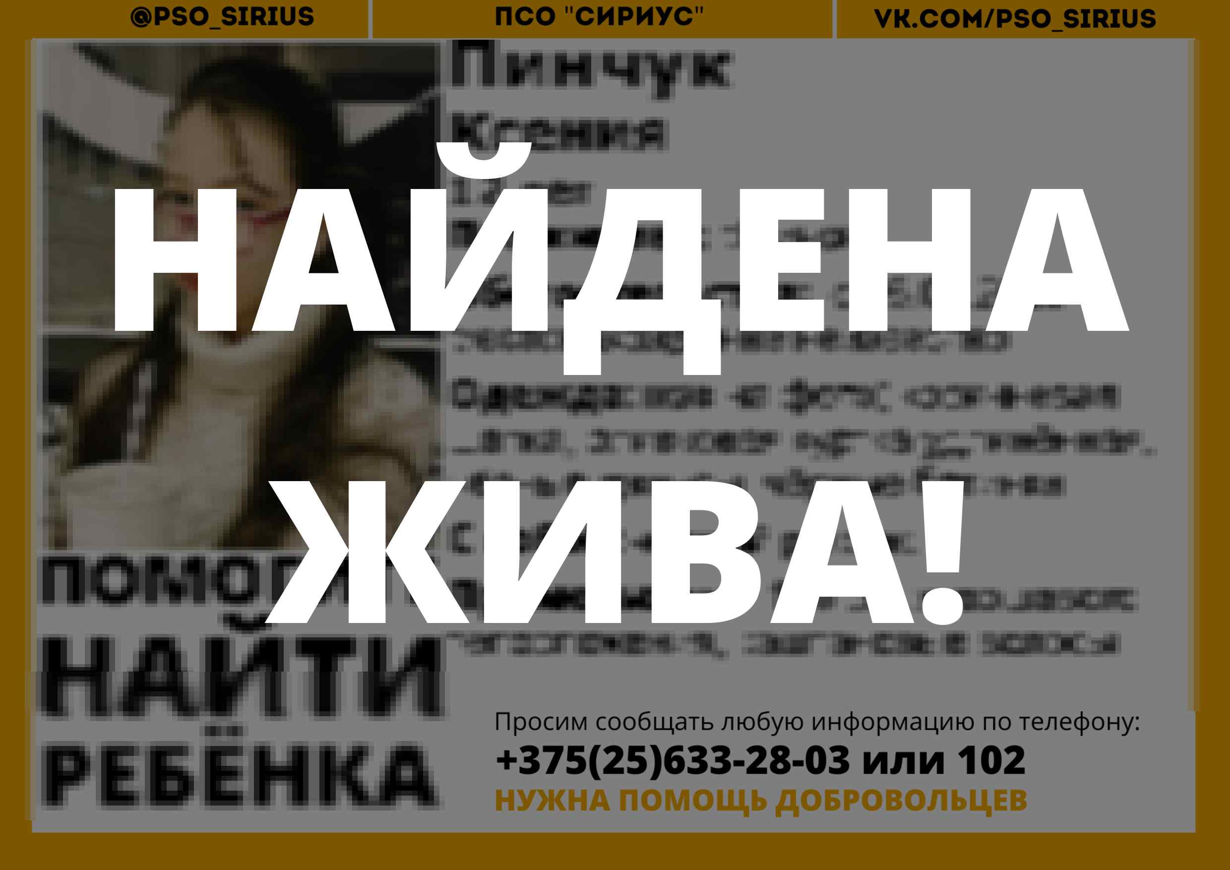 Всех, кто владеет информацией, просим сообщить: ПСО "Сириус" +375(25)633-28-03 |