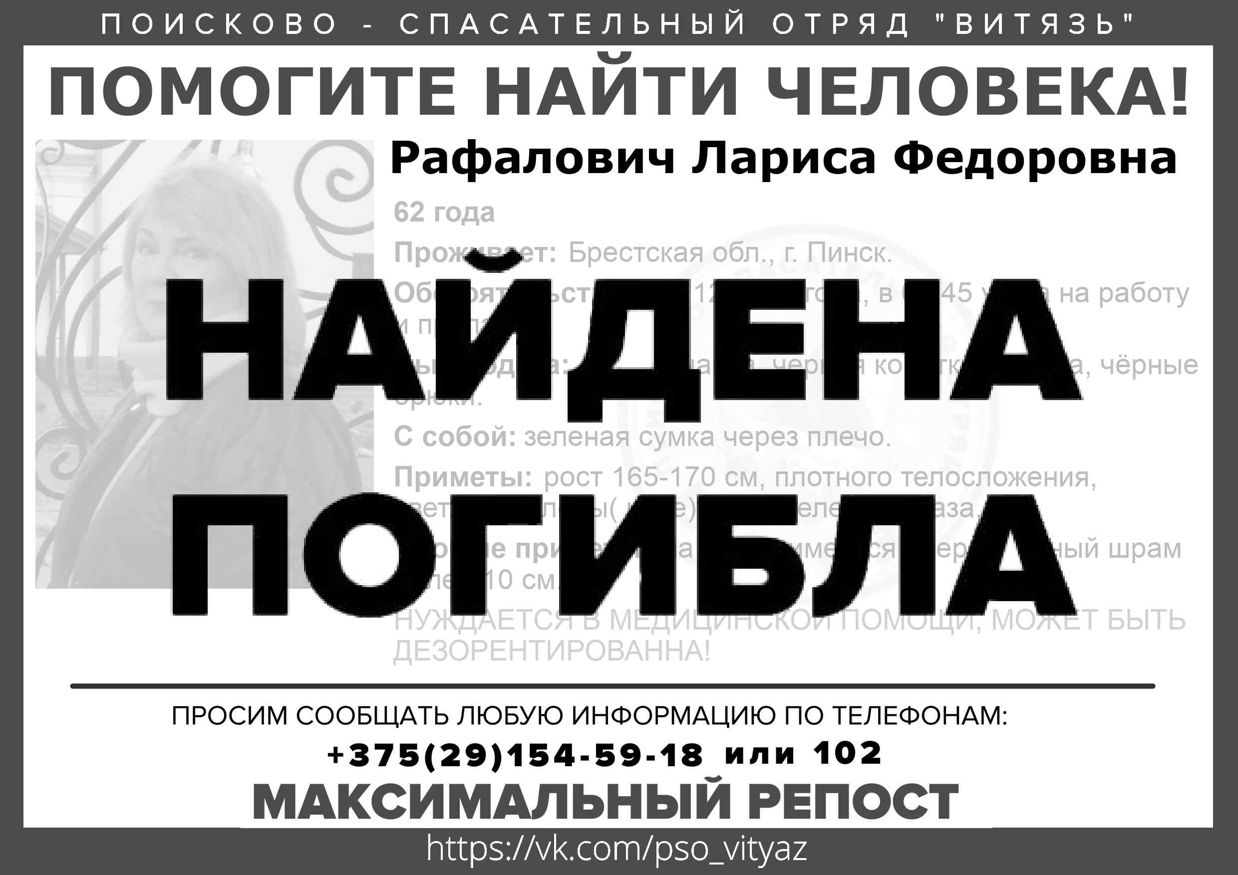 Всех, кто владеет информацией, просим сообщить: ПСО "ВИТЯЗЬ" +375(29)154-59-18 |