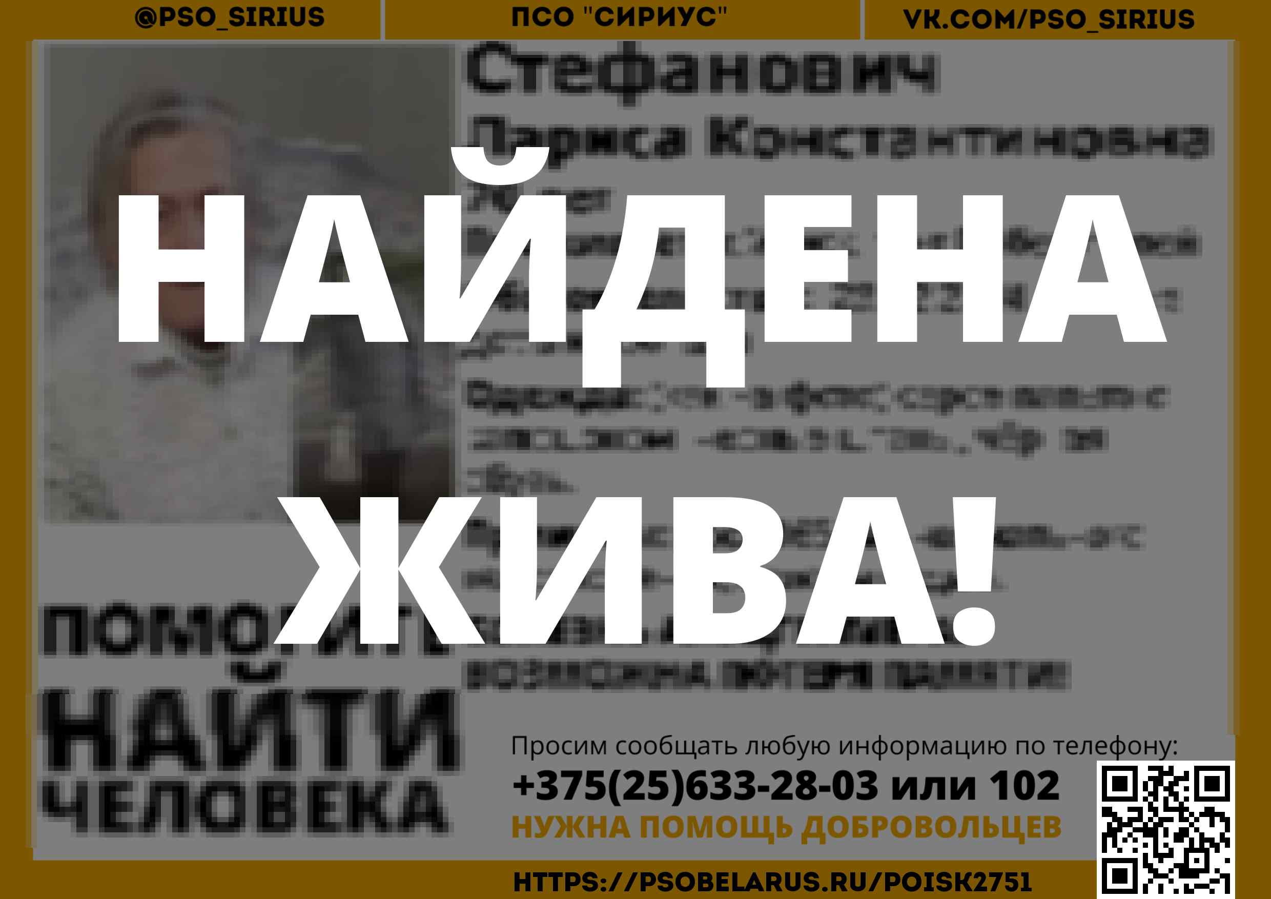 Всех, кто владеет информацией, просим сообщить: ПСО "Сириус" +375(25)633-28-03 |