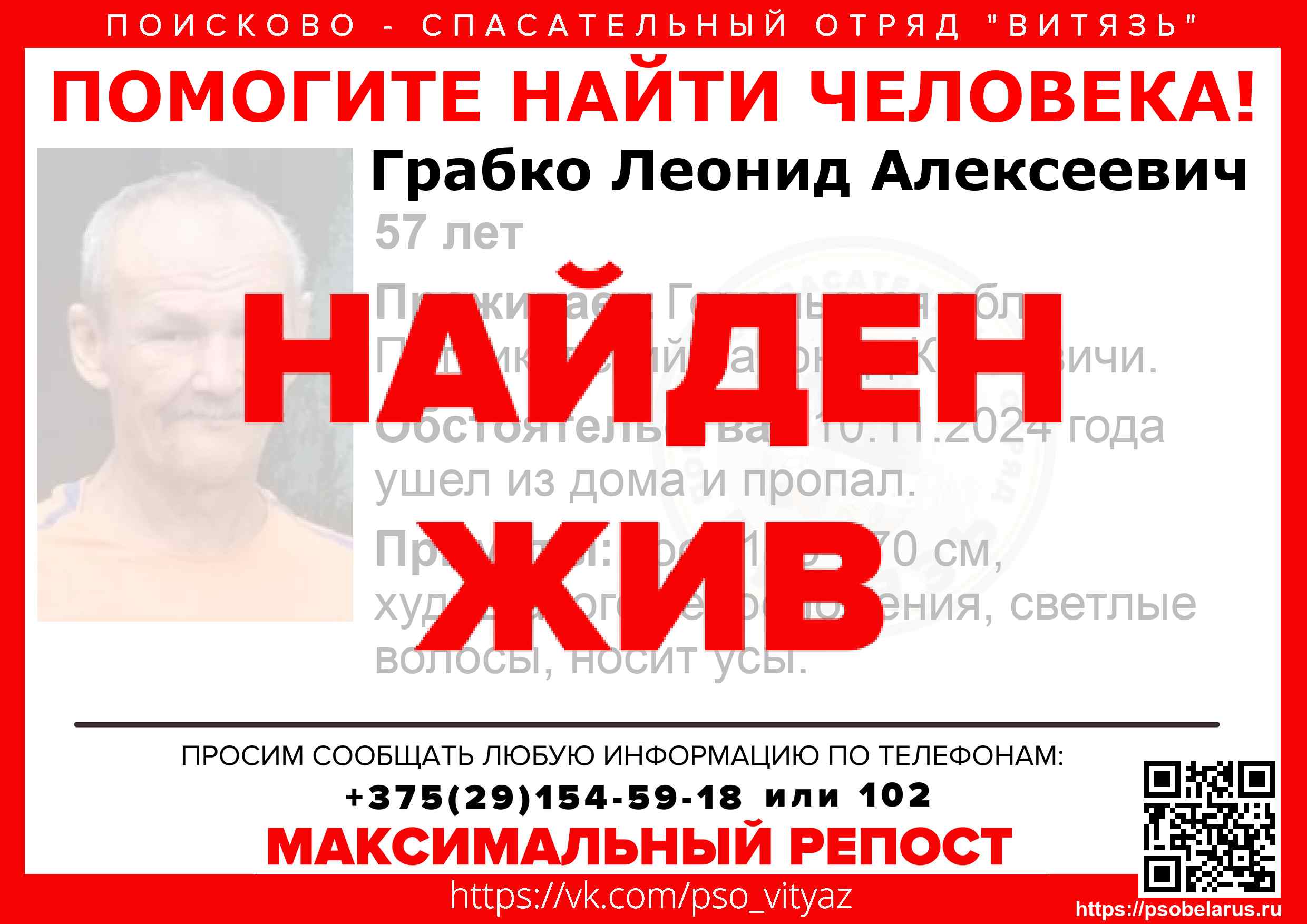 Всех, кто владеет информацией, просим сообщить: ПСО "ВИТЯЗЬ" +375(29)154-59-18 |